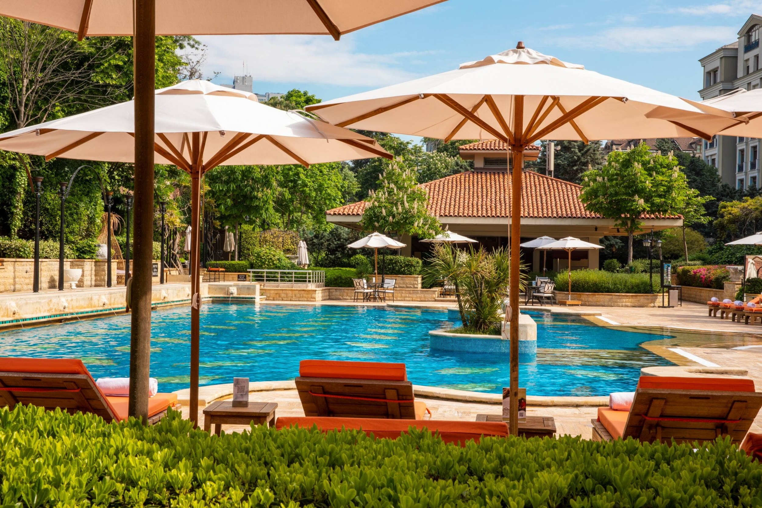 Suite (80 кв. м): гостиная и обеденная зоны, мини-кухня, спальня с кроватью king-size или двумя отдельными кроватями, гардеробная, ванная комната с ванной и душевой кабиной с функцией «тропический дождь». Дополнительно: Wi-Fi доступ в Интернет, стереосистема, факс. Вид на город, пролив Босфор или бассейн.