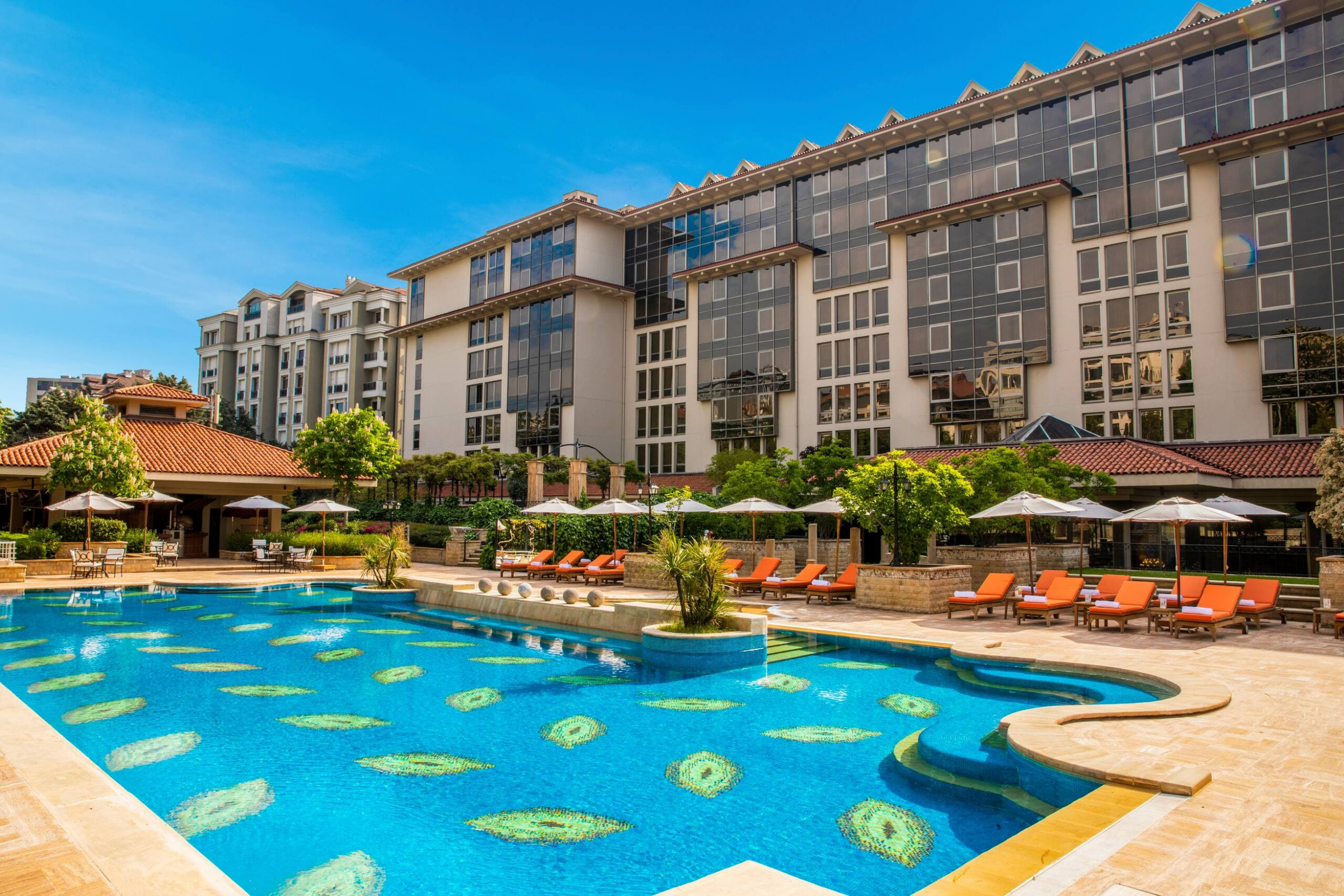 Grand executive suite (120 кв. м): гостиная с обеденной зоной, кабинет, мини-кухня, спальня с кроватью king-size, гардеробная, ванная комната с ванной и душем с функцией «тропический дождь». Дополнительно: Wi-Fi доступ в Интернет, DVD-плеер, стереосистема, факс. Вид на город, пролив Босфор или бассейн.