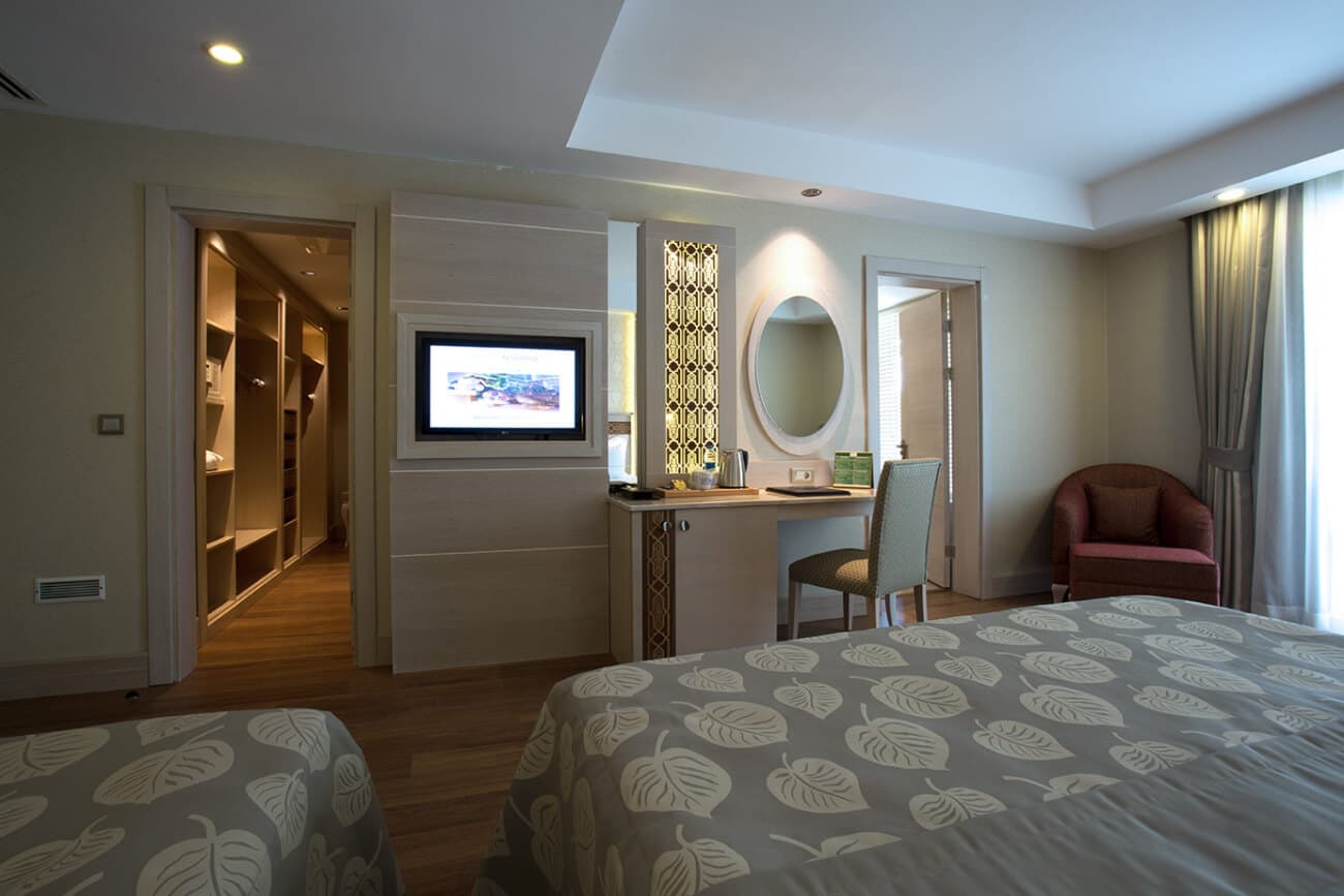 62 двухкомнатных Deluxe Superior Family Room (2 спальни с дверью, гардеробная, 2 ванные комнаты, балкон с мебелью, макс. 4+2 чел., 90–100 м2);