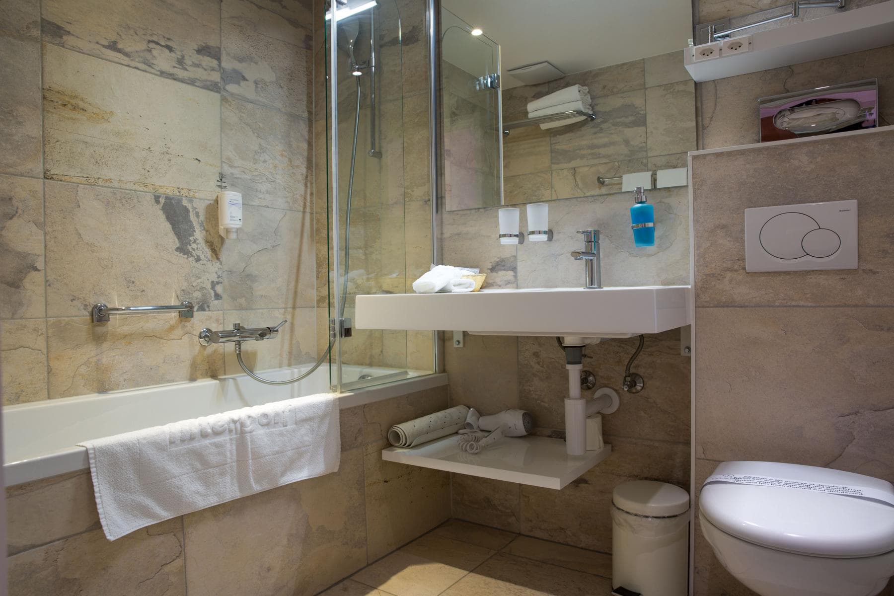Ванная комната, ТВ, телефон, радио, мини-бар, сейф, фен, бесплатный WiFi; большинство номеров с балконом.