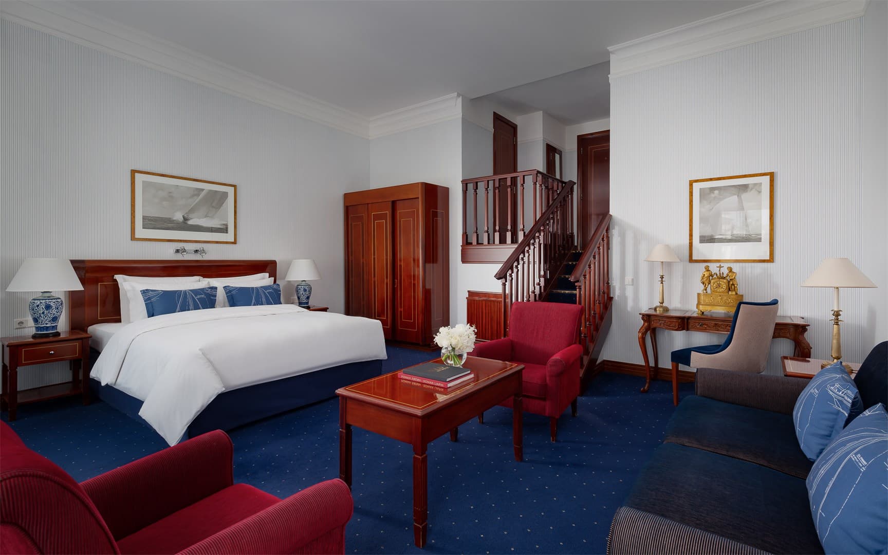 Executive suite (Представительский люкс) (65-75 кв. м): балкон (в некоторых номерах), гостиная, спальня с двуспальной или двумя отдельными кроватями, ванная комната с ванной и душевой кабиной. Вид на реку, Дворцовую площадь, Эрмитаж или внутренний двор. Возможно объединение номеров.
