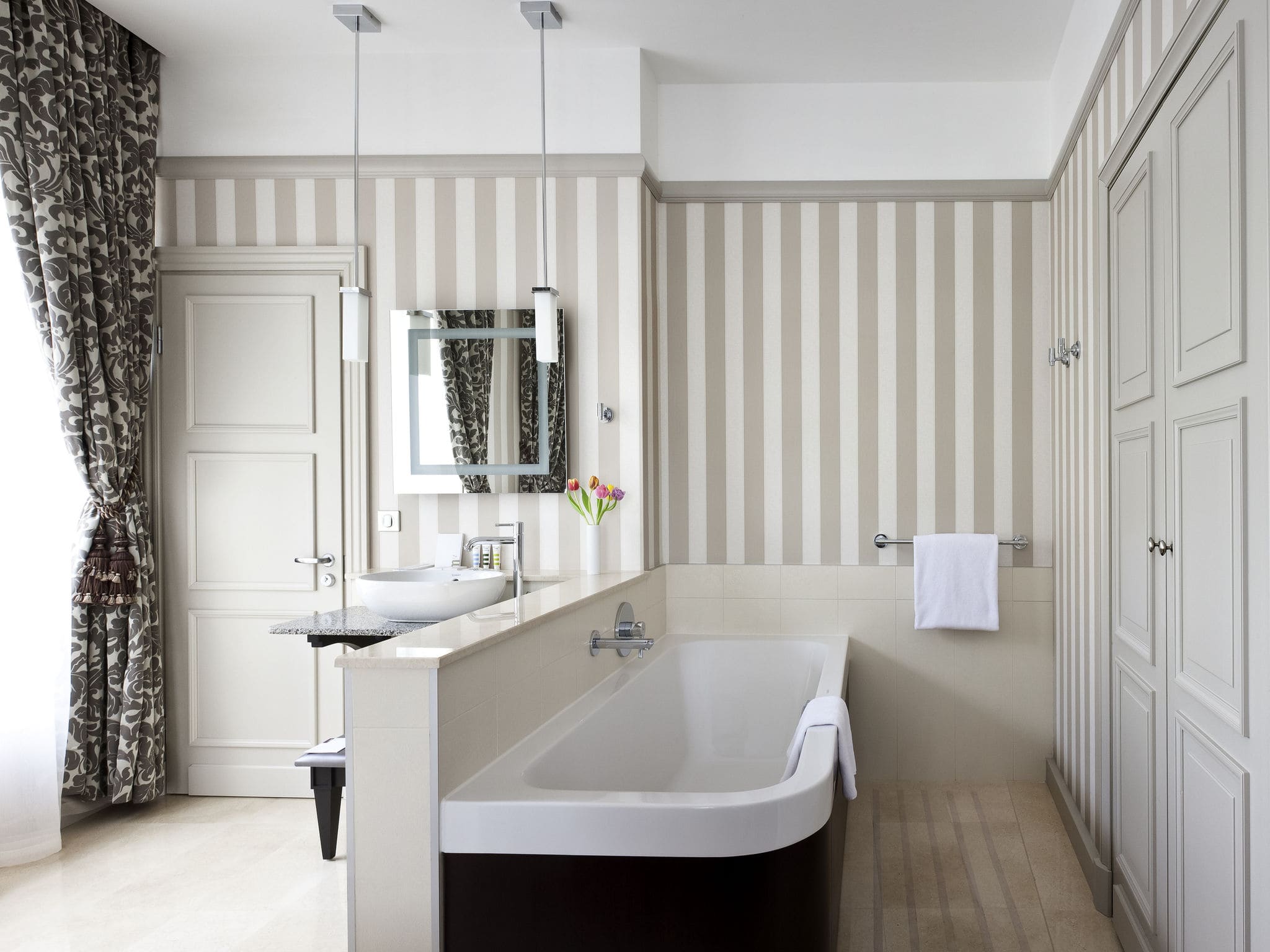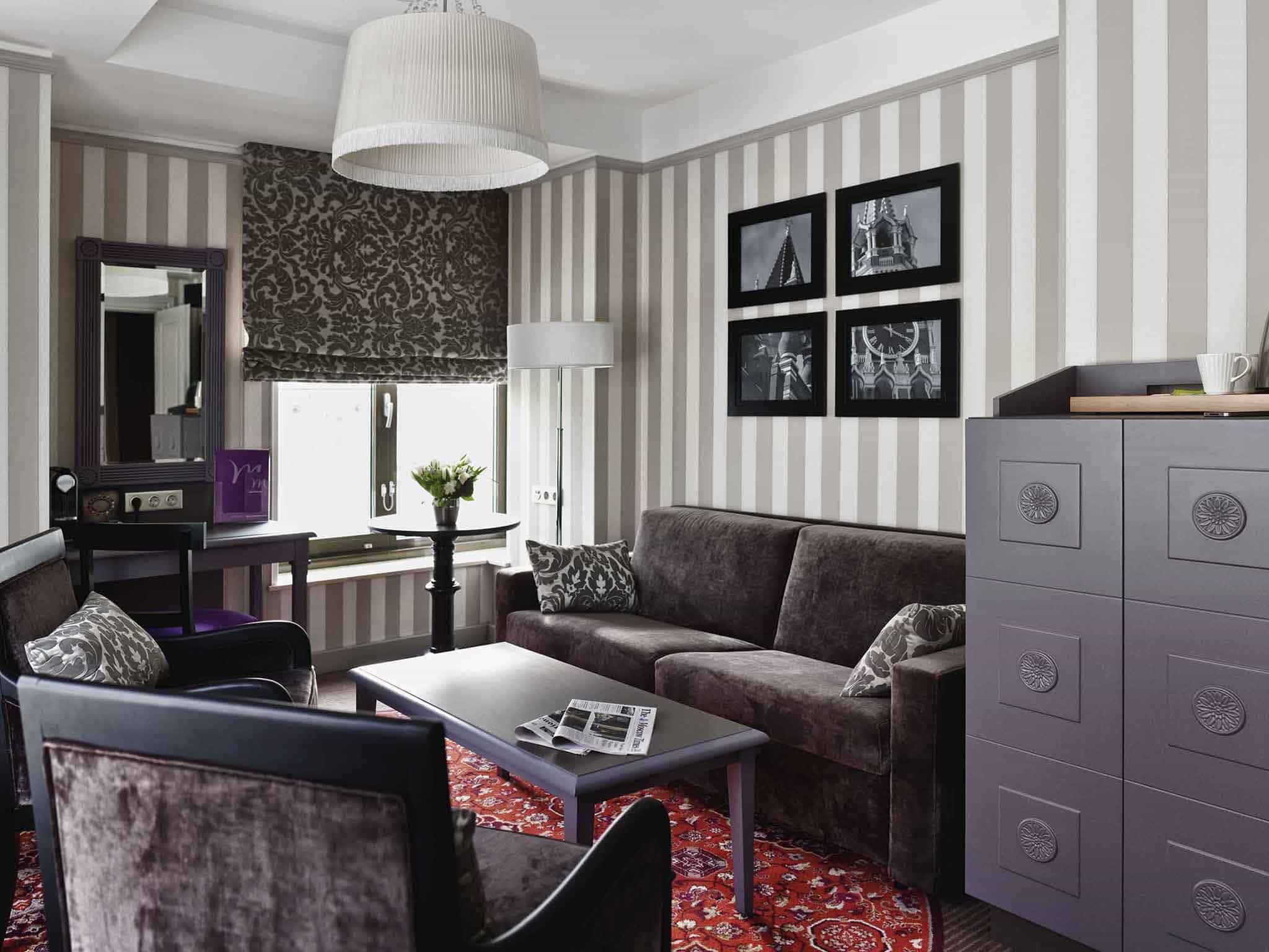 Deluxe suite with 1 king-size bed and sofa (люкс Deluxe с большой двуспальной кроватью и диваном) (от 42 кв. м) : гостиная, спальня с кроватью king-size, ванная комната с ванной. Номер имеет открытую планировку: спальная и ванная зоны не разделены. Дополнительно: кофемашина Illy.