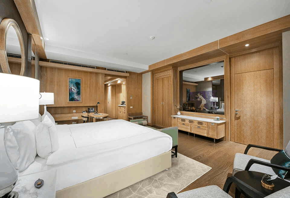 Просторные номера курортного отеля Regnum Carya выходят на собственный балкон или террасу. Все номера оснащены ЖК-телевизором со спутниковыми каналами. В некоторых люксах установлена гидромассажная ванна.