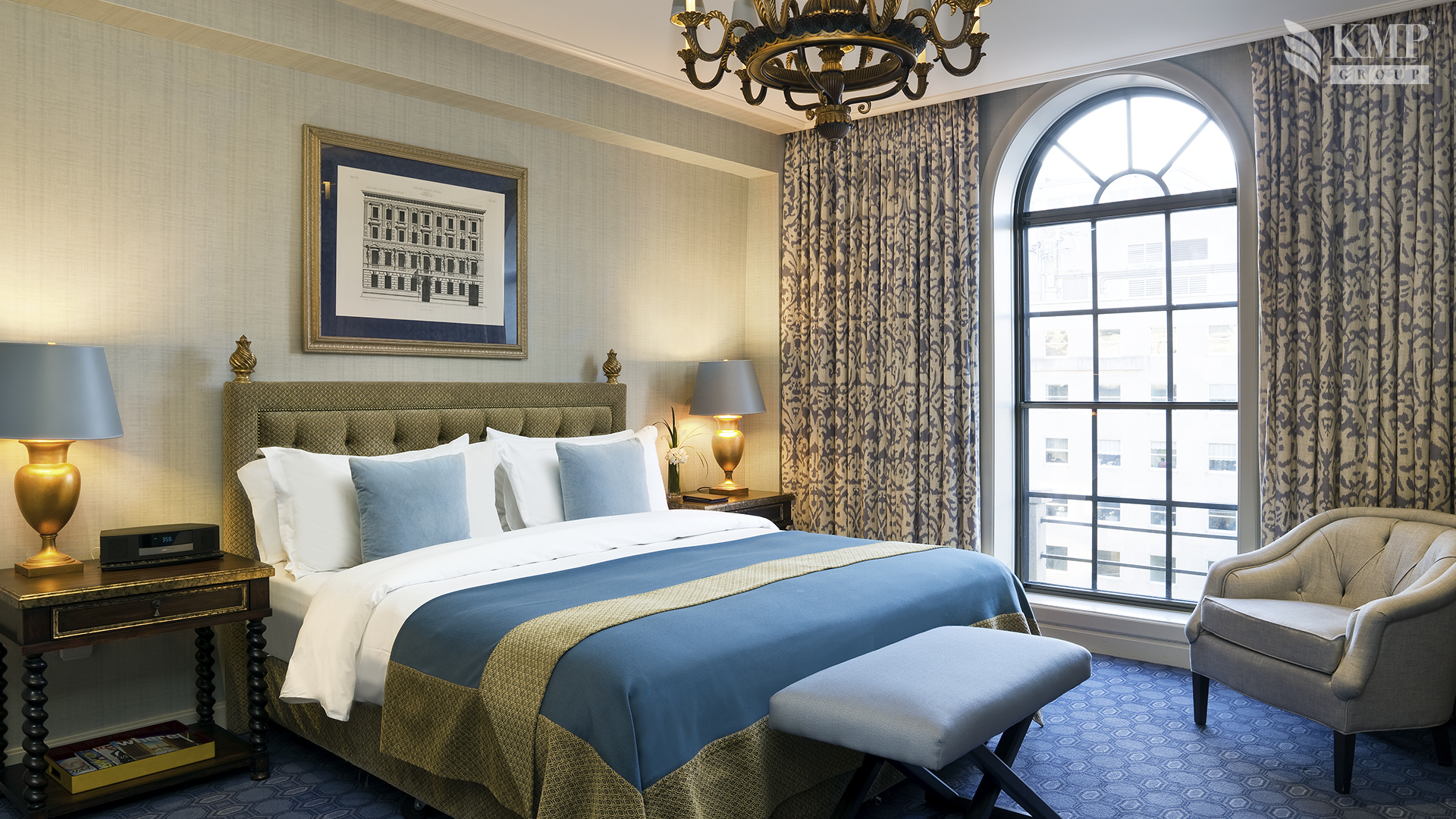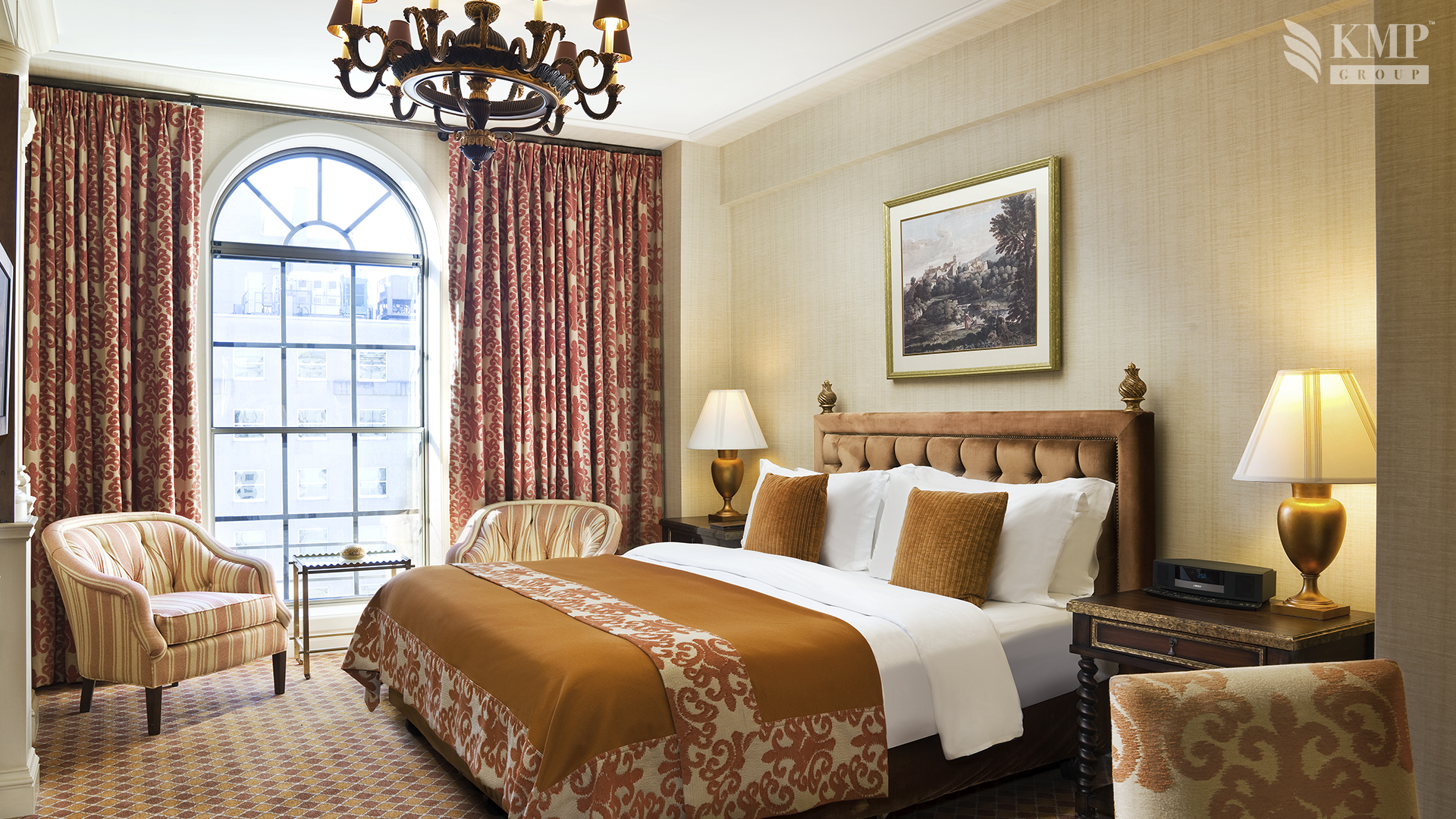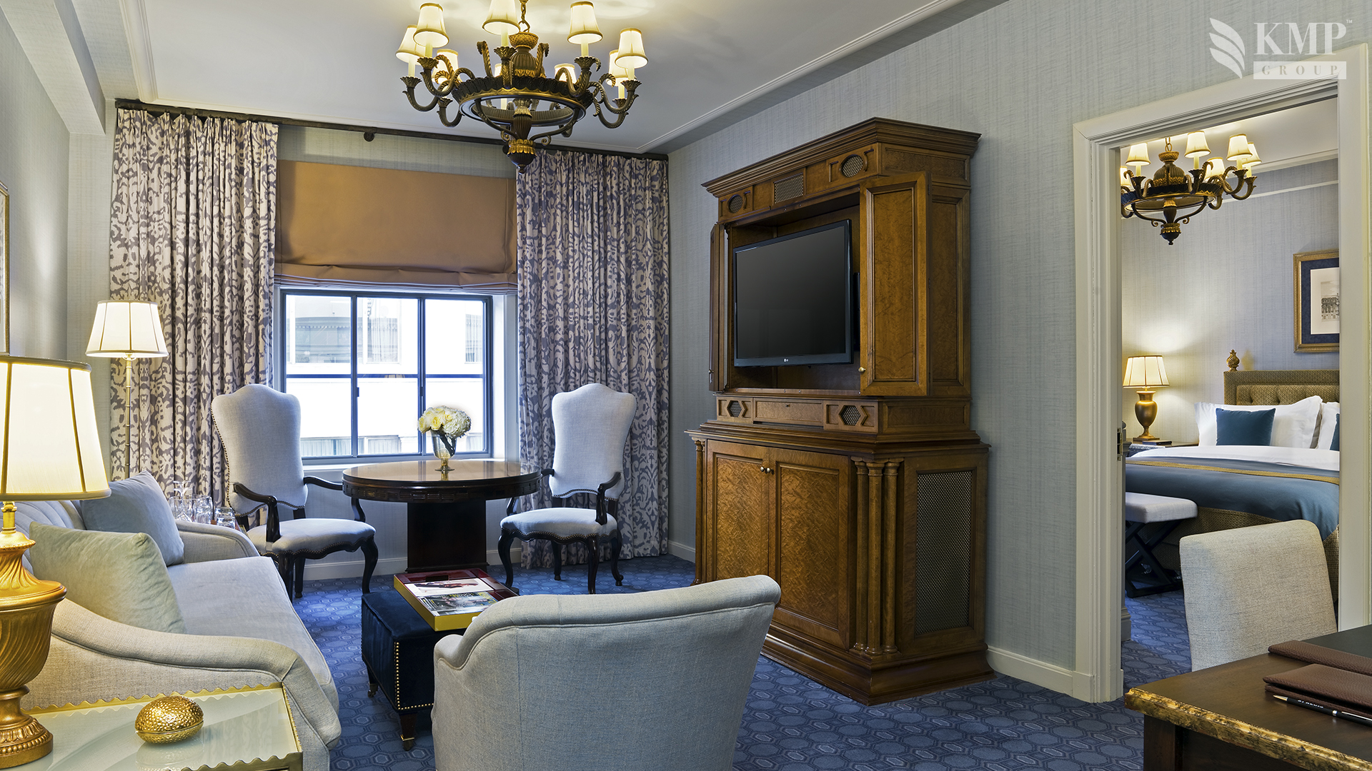 St. Regis suite (96 кв. м). Прихожая, гостиная, спальня с кроватью king-size, ванная комната с ванной и душевой кабиной. Вид на 16-ю улицу. Возможно объединение с номером категории Superior room.