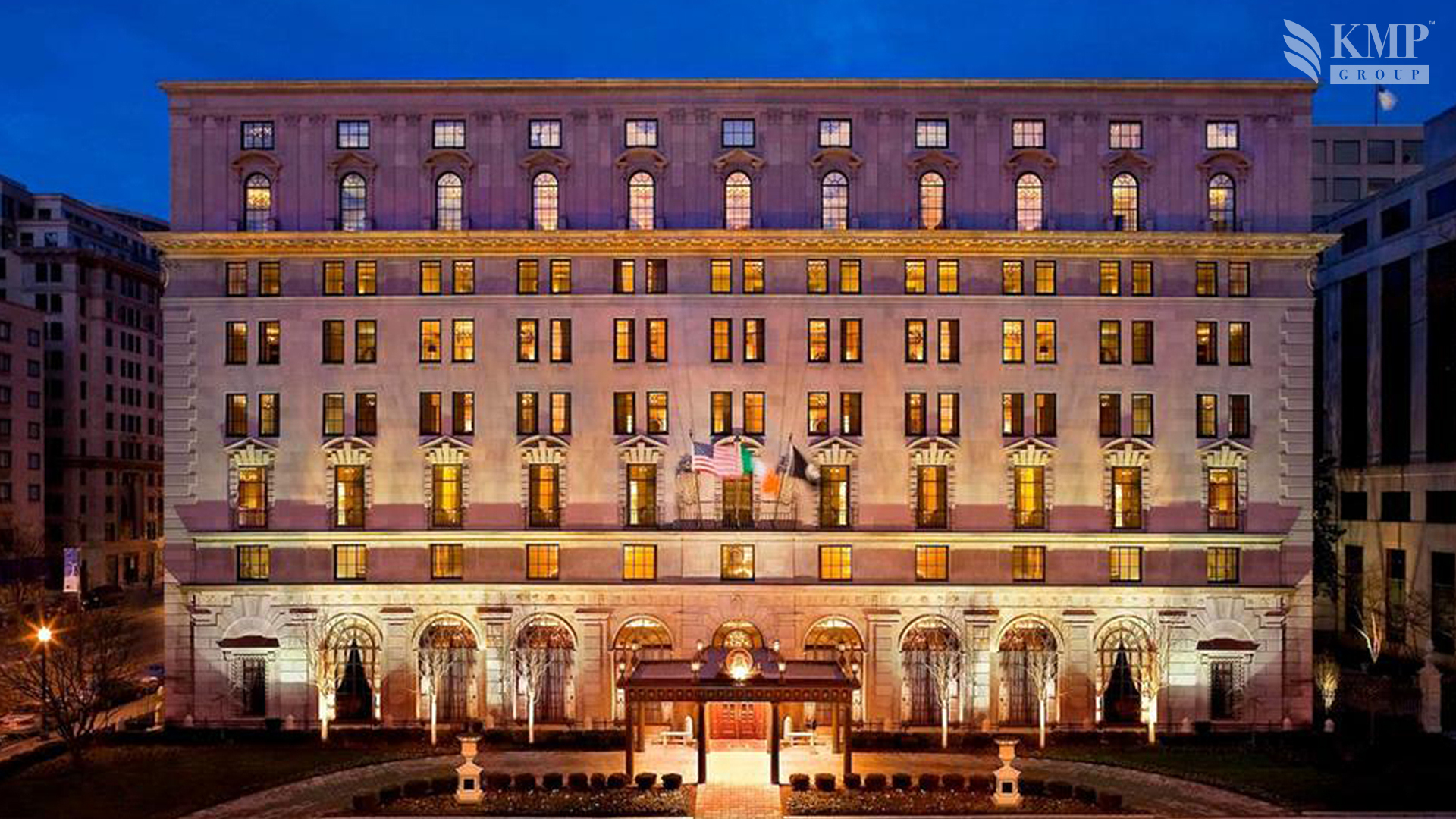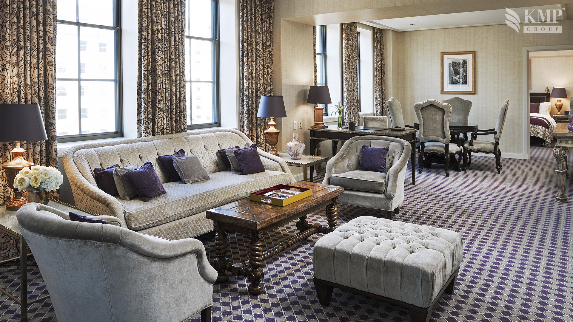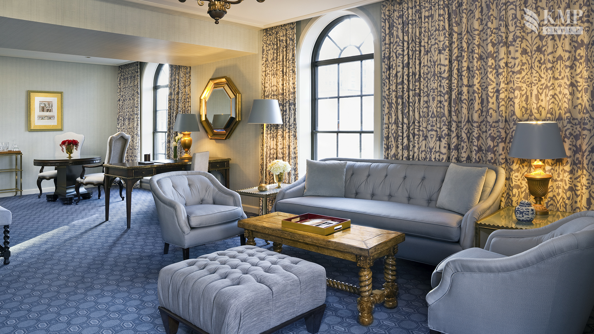 Empire suite (128 кв. м). Гостиная, столовая (обеденный стол на 10 персон), кладовая, спальня с кроватью king-size, гардеробная, ванная комната с ванной и душевой кабиной, гостевой туалет. Вид на 16-ю улицу и K Street.