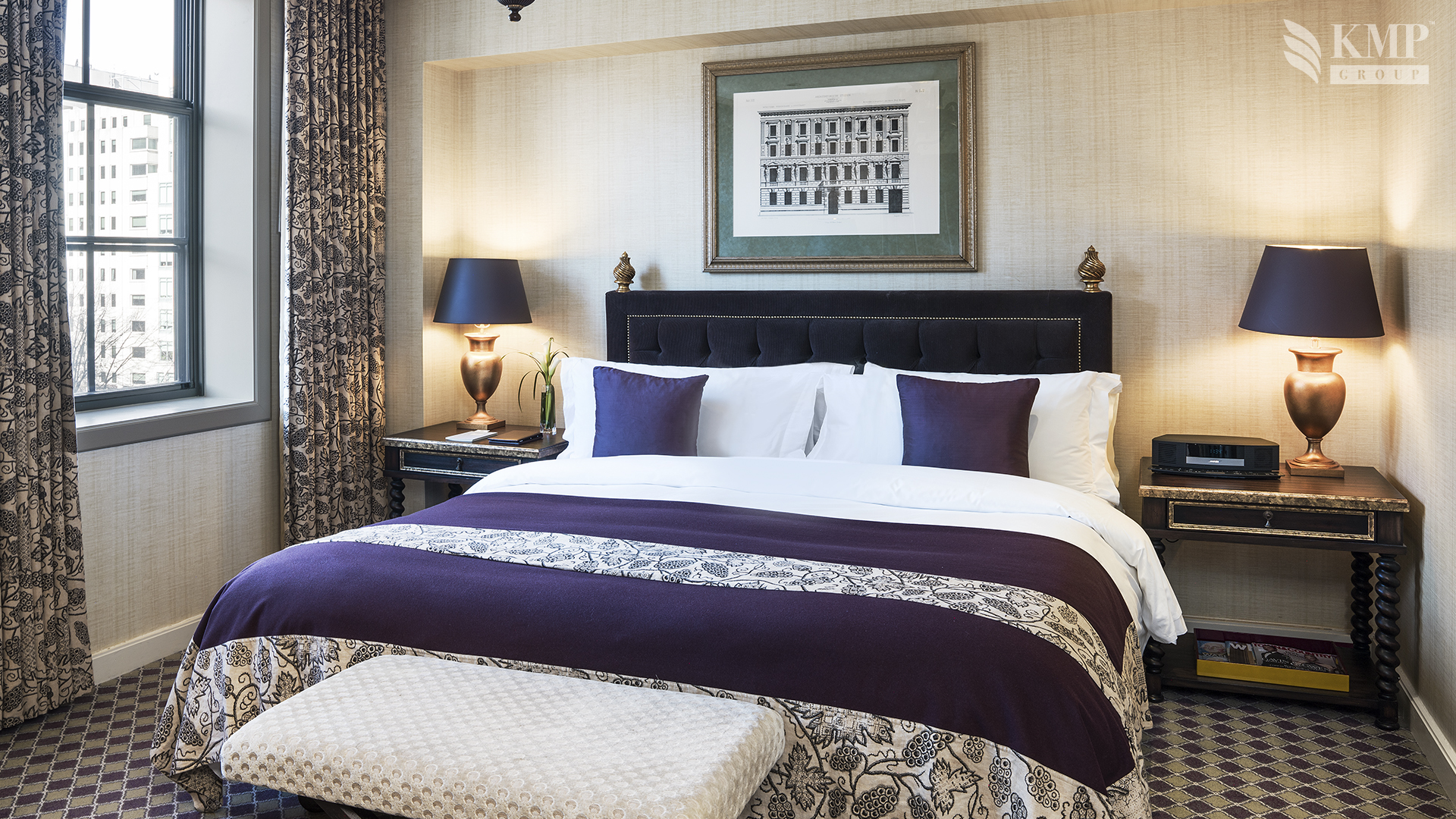 Knickerbocker suite (94 кв. м). Прихожая, гостиная с обеденной зоной, спальня с кроватью king-size, ванная комната с ванной и душевой кабиной. Вид на 16-ю улицу. Возможно объединение с номером категории Caroline Astor suite.