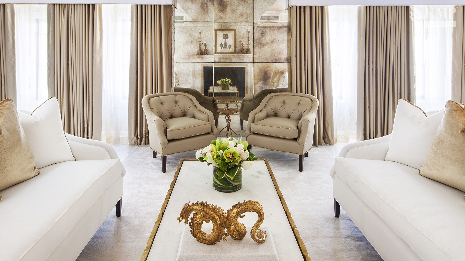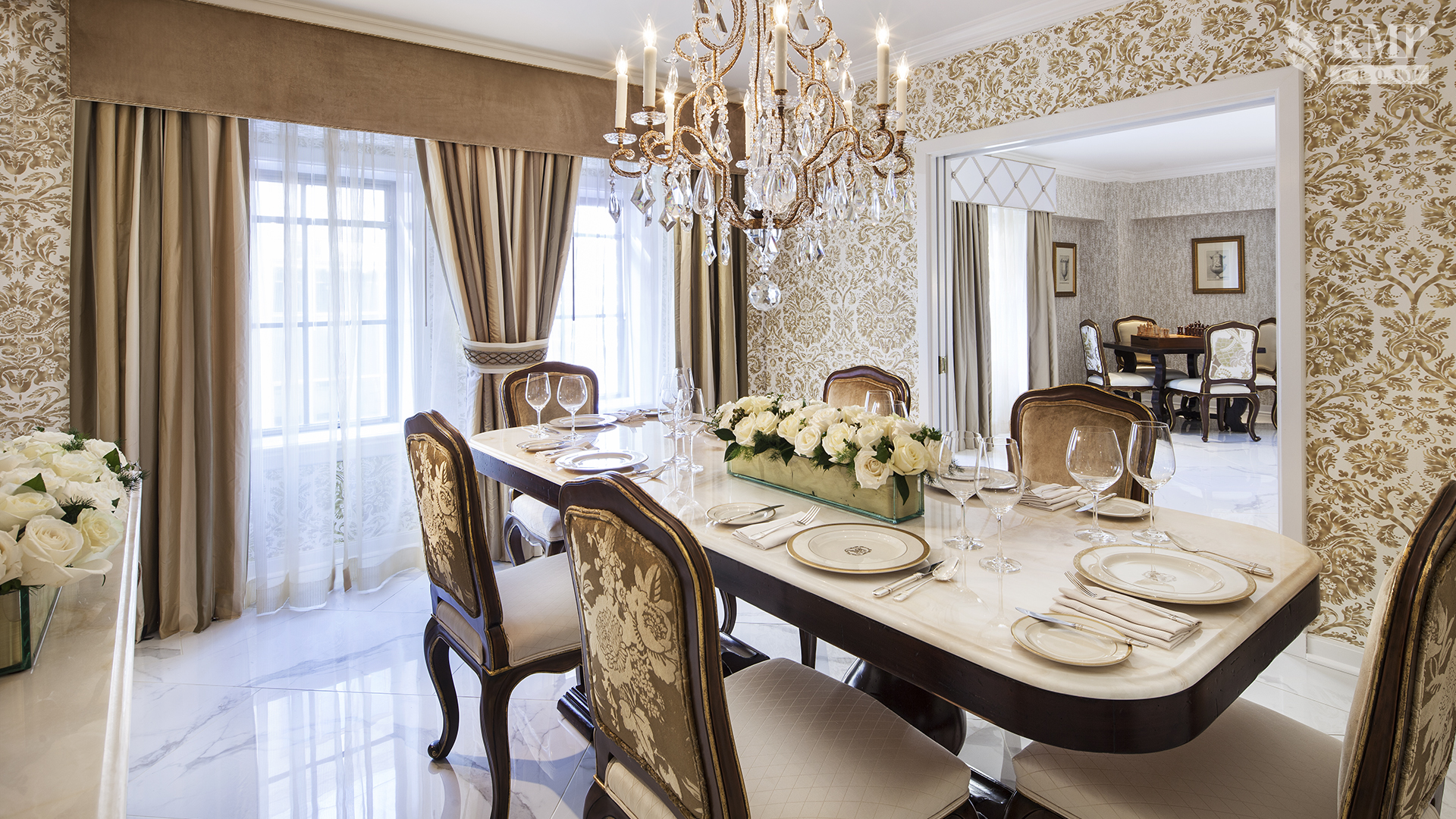 Presidential suite (233 кв. м). Фойе, гостиная с двумя каминами, столовая, (обеденный стол на 10 персон), библиотека, кладовая, спальня с кроватью king-size, 2 гардеробные, 2 ванные комнаты, гостевой туалет. Возможно объединение с номером категории Superior room.