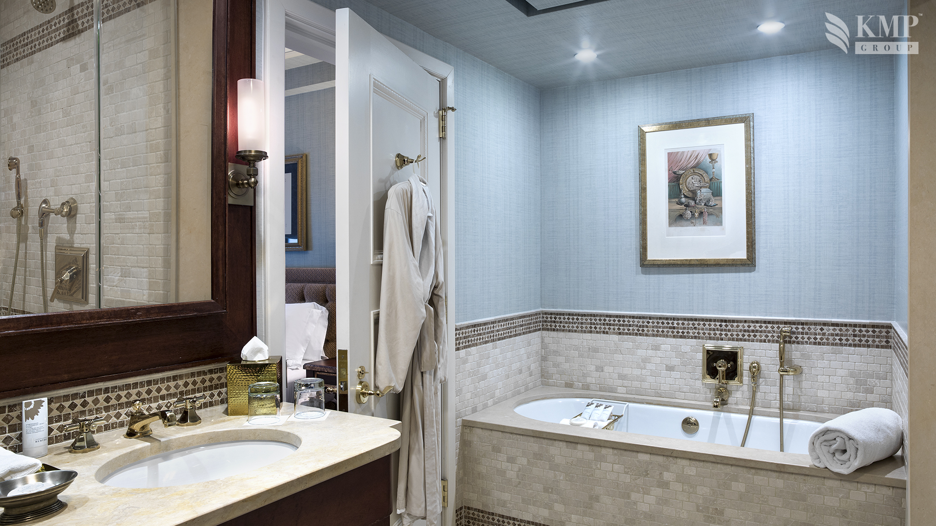 Metropolitan suite (58 кв. м). Прихожая, спальня с гостиной зоной (кровать king-size), гардеробная, ванная комната с ванной и душевой кабиной.