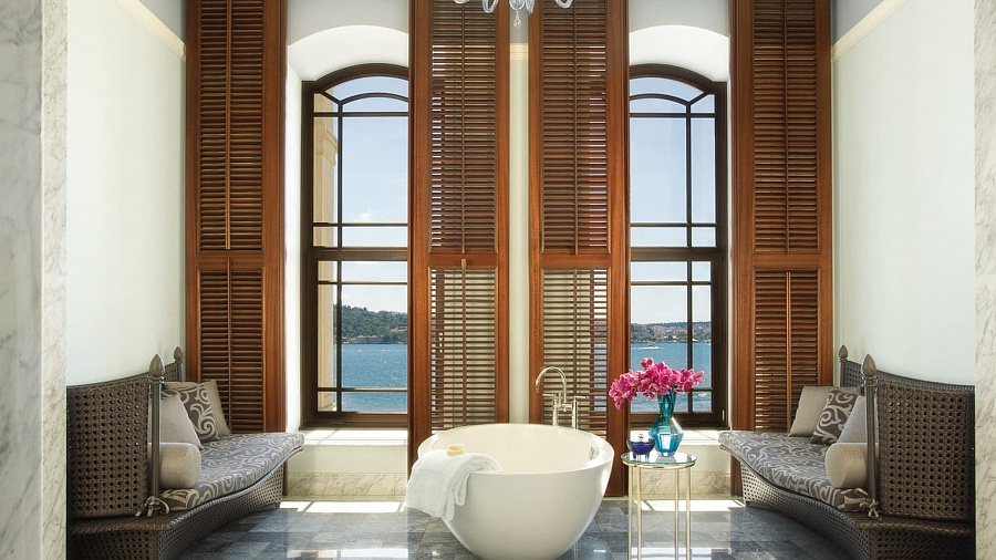 One-bedroom Bosphorus palace suite (80 кв. м): прихожая, гостиная с обеденной зоной (стол на 4 персоны), спальня с кроватью king-size, гардеробная зона, ванная комната с ванной и душевой кабиной, гостевой туалет. Расположены в корпусе исторического дворца на первом и втором этаже. Панорамный вид на пролив Босфор.