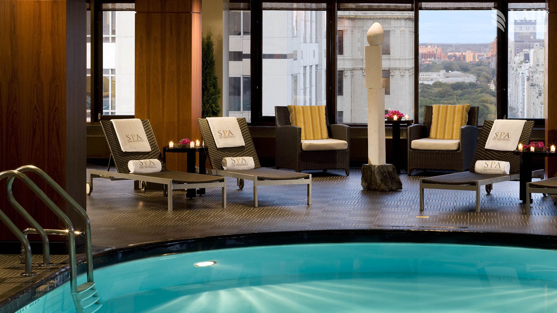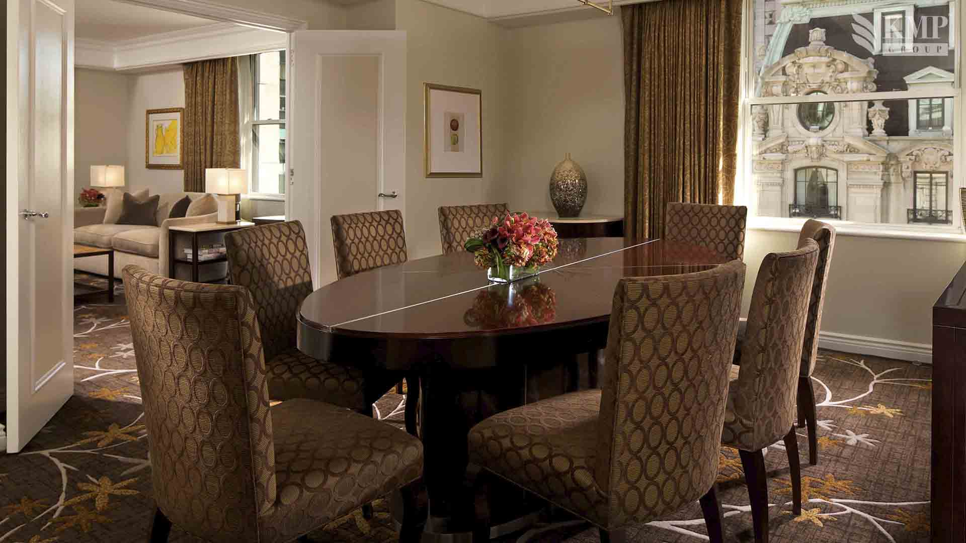 The Peninsula suite (307 кв. м): гостиная, столовая (стол на 10 персон), библиотека, комната для прислуги, 2 спальни, ванная комната с ванной, джакузи и отдельной душевой кабиной, гостевая ванная комната. Дополнительно: принтер, возможность подключения iPod, 3 телевизора, фортепьяно. Панорамный вид на город, на Пятую авеню и 54 улицу. Расположены на 19 этаже. Возможно присоединение дополнительной спальни.