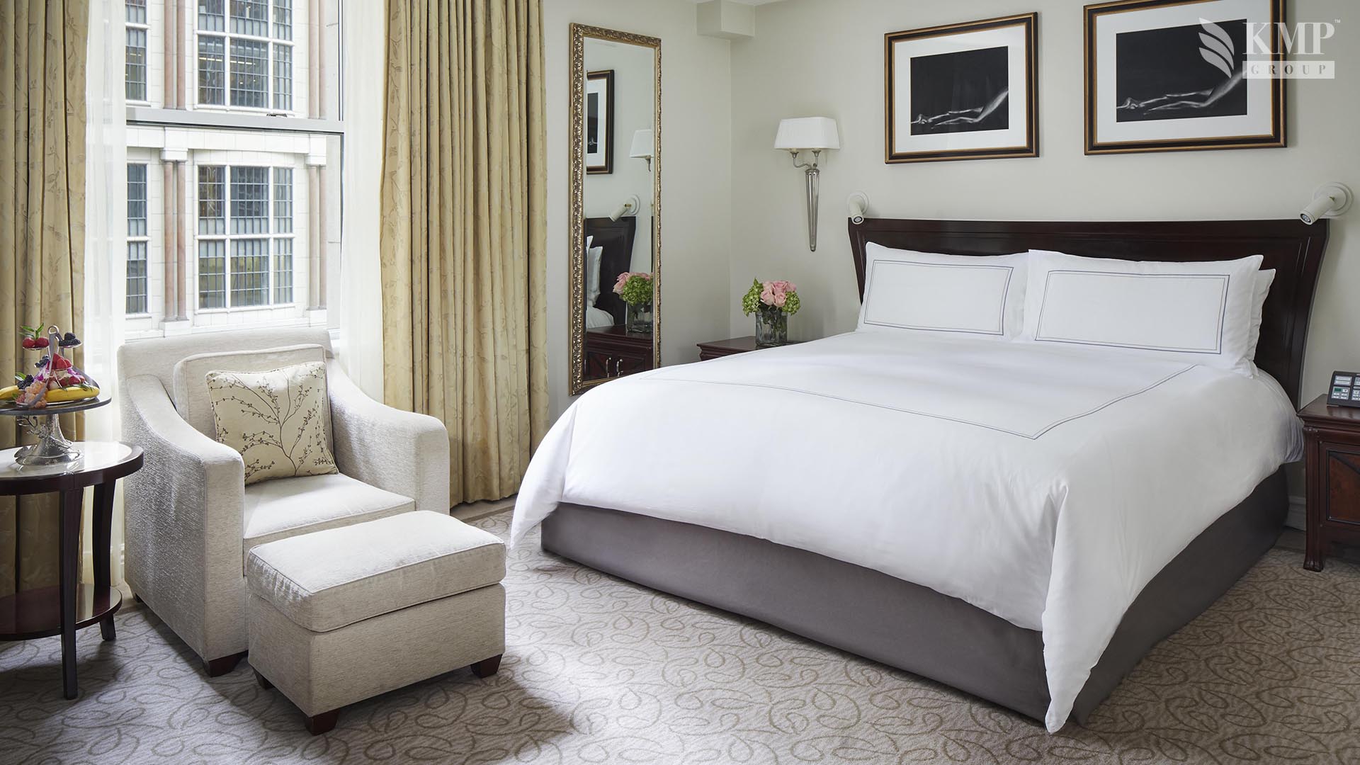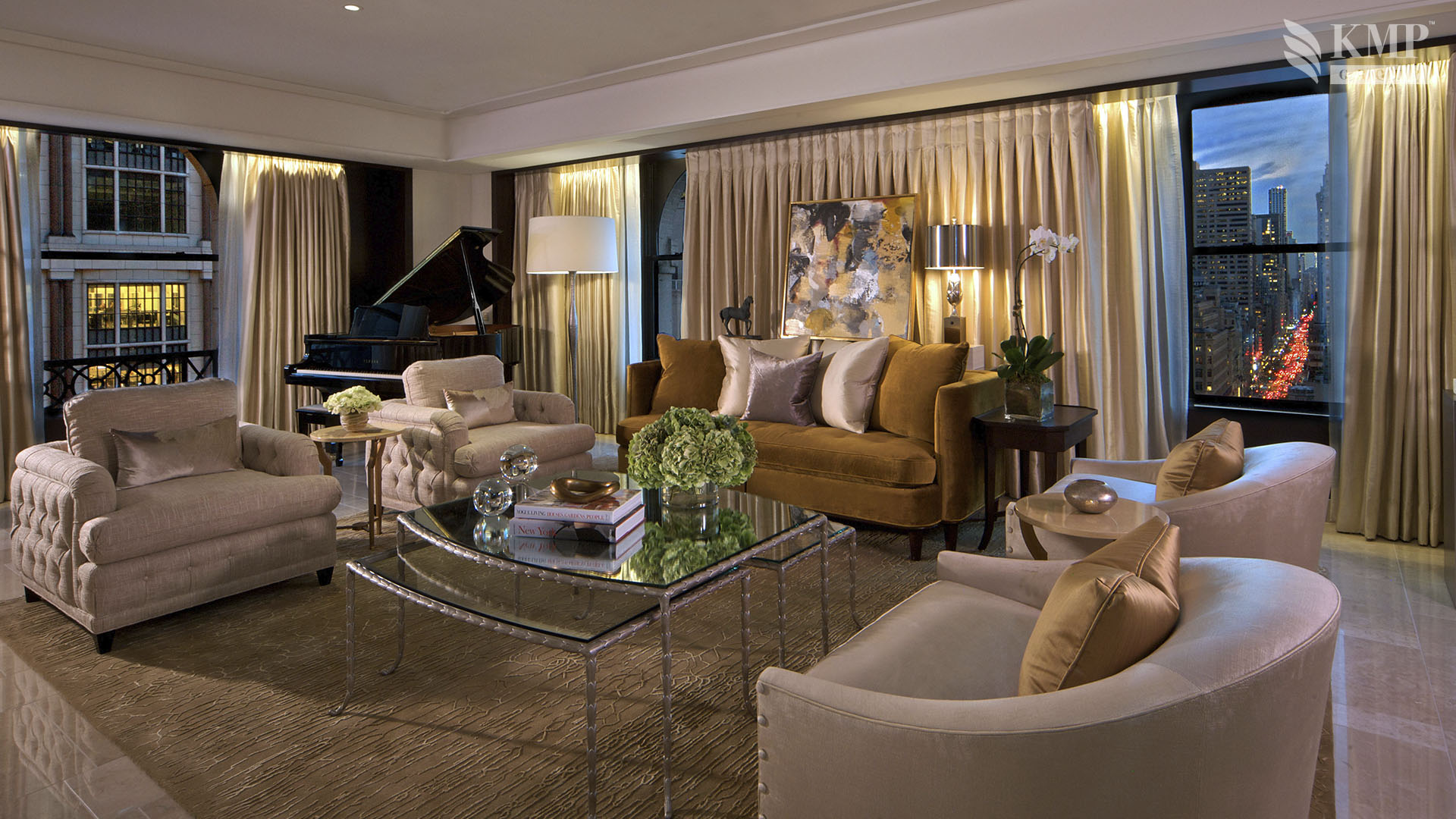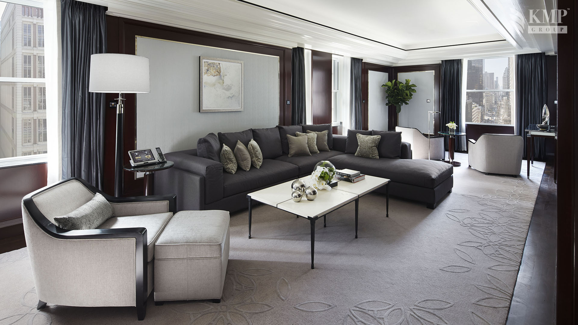 Grand suite (151 кв. м): холл, гостиная, столовая (стол на 8 персон), комната для прислуги, спальня с двуспальной кроватью, гардеробная, ванная комната с ванной и отдельной душевой кабиной, гостевая ванная комната. Дополнительно: принтер, возможность подключения iPod, 2 плазменные панели, декоративный камин. Расположены на 20 этаже. Вид на Пятую авеню и на 55 улицу.