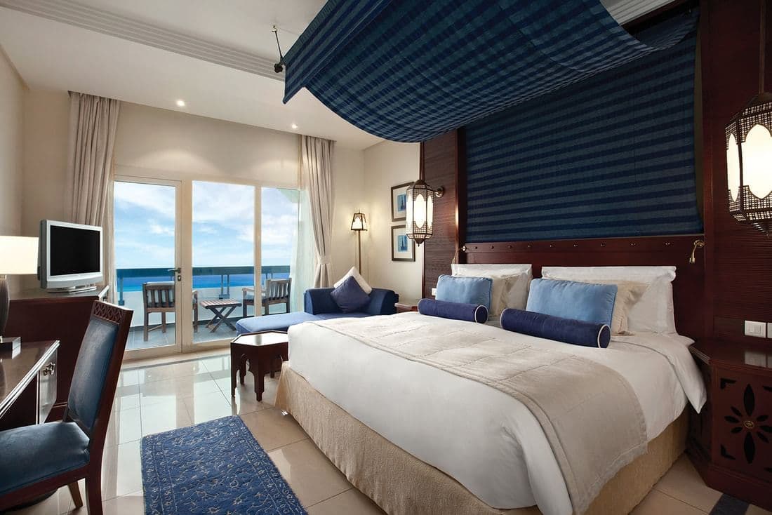 Номера выдержаны в светлых тонах и обставлены элегантной деревянной мебелью в ближневосточном стиле. Из роскошных номеров и люксов можно выйти на собственный меблированный балкон или террасу.