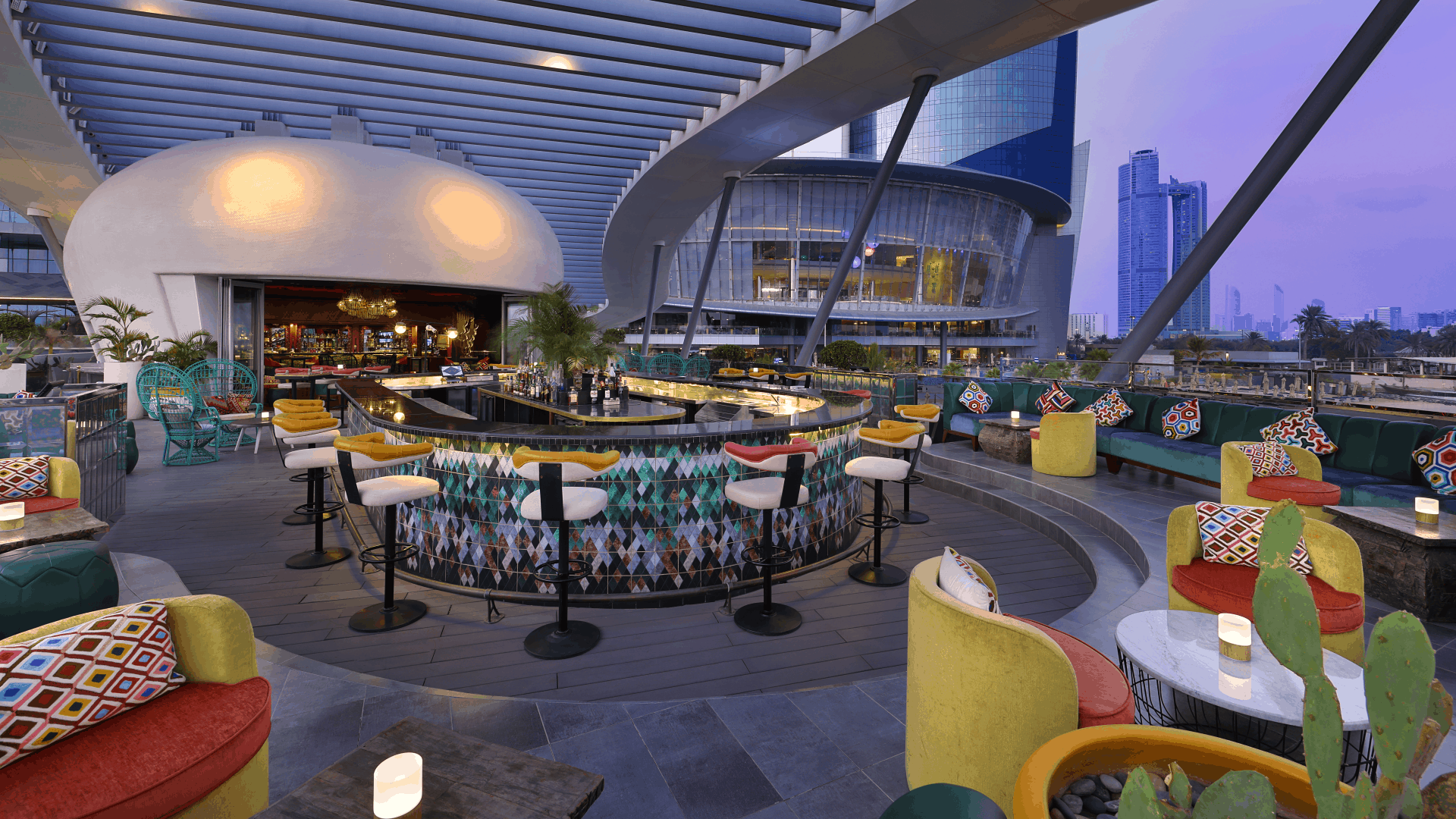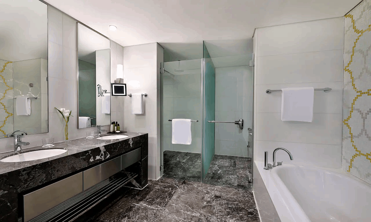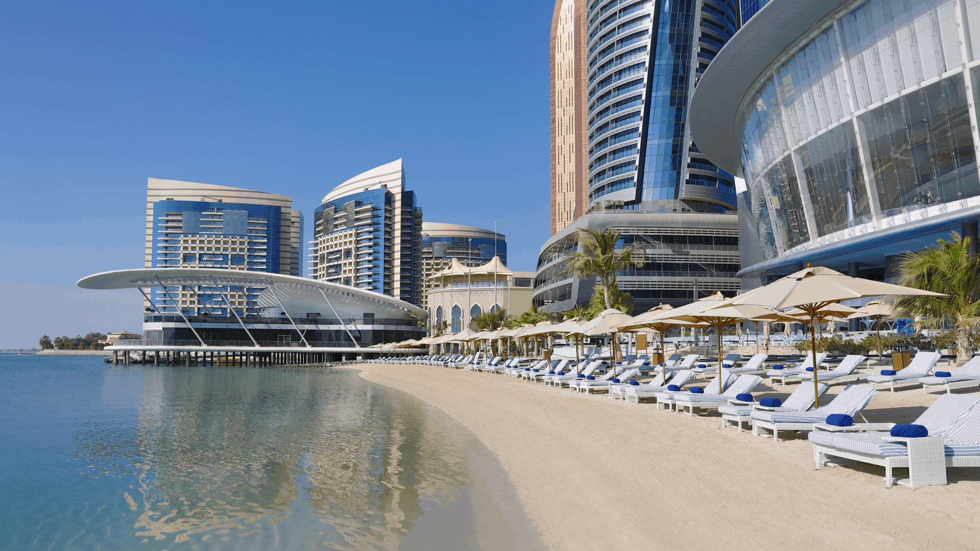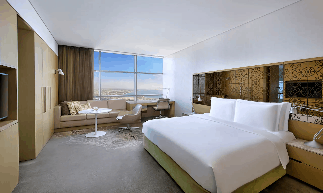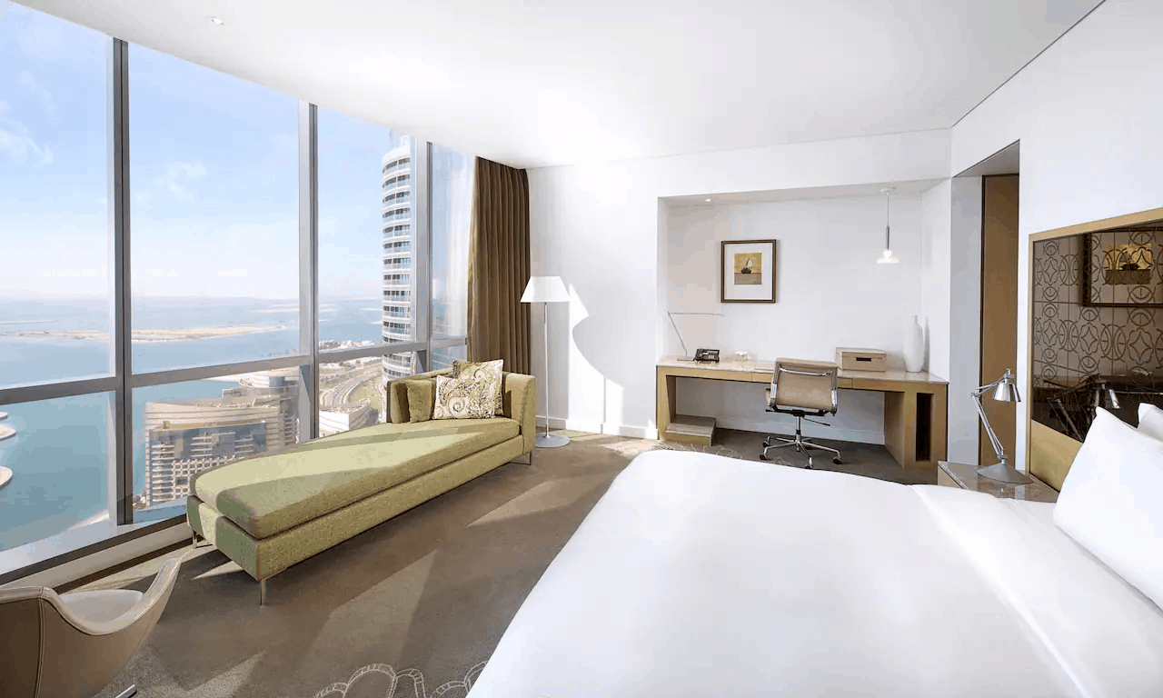 Расположенный в престижном районе Khalideya отель Jumeirah at Etihad Towers занимает одну из пяти высотных башен, объединенных общим пространством – «Подиумом». На нем находятся рестораны и уютные кафе с изумительным видом на море, многочисленные магазины и бутики. К услугам гостей 382 просторных номера, 199 эксклюзивных апартаментов, великолепный 130-метровый пляж, превосходный SPA-центр Talise, бизнес-центр и 13 конференц-залов. Особые восточные черты современному интерьеру отеля придают картины и фотографии из частной коллекции шейха Сурура бин Мухаммед Аль-Нахаяна. Порадует гостей и великолепная кухня Jumeirah at Etihad Towers. В уютном ресторане Quest с потрясающим видом на Персидский залив подают азиатские блюда. В ресторане Rosewater работает «открытая кухня», и готовят изысканные десерты. Поклонники восточной кухни оценят японские блюда в Tori No Su. Observation Deck at 300 – кафе и одновременно смотровая площадка, расположенная на 74 этаже. Отсюда открывается захватывающая панорама на Абу-Даби.