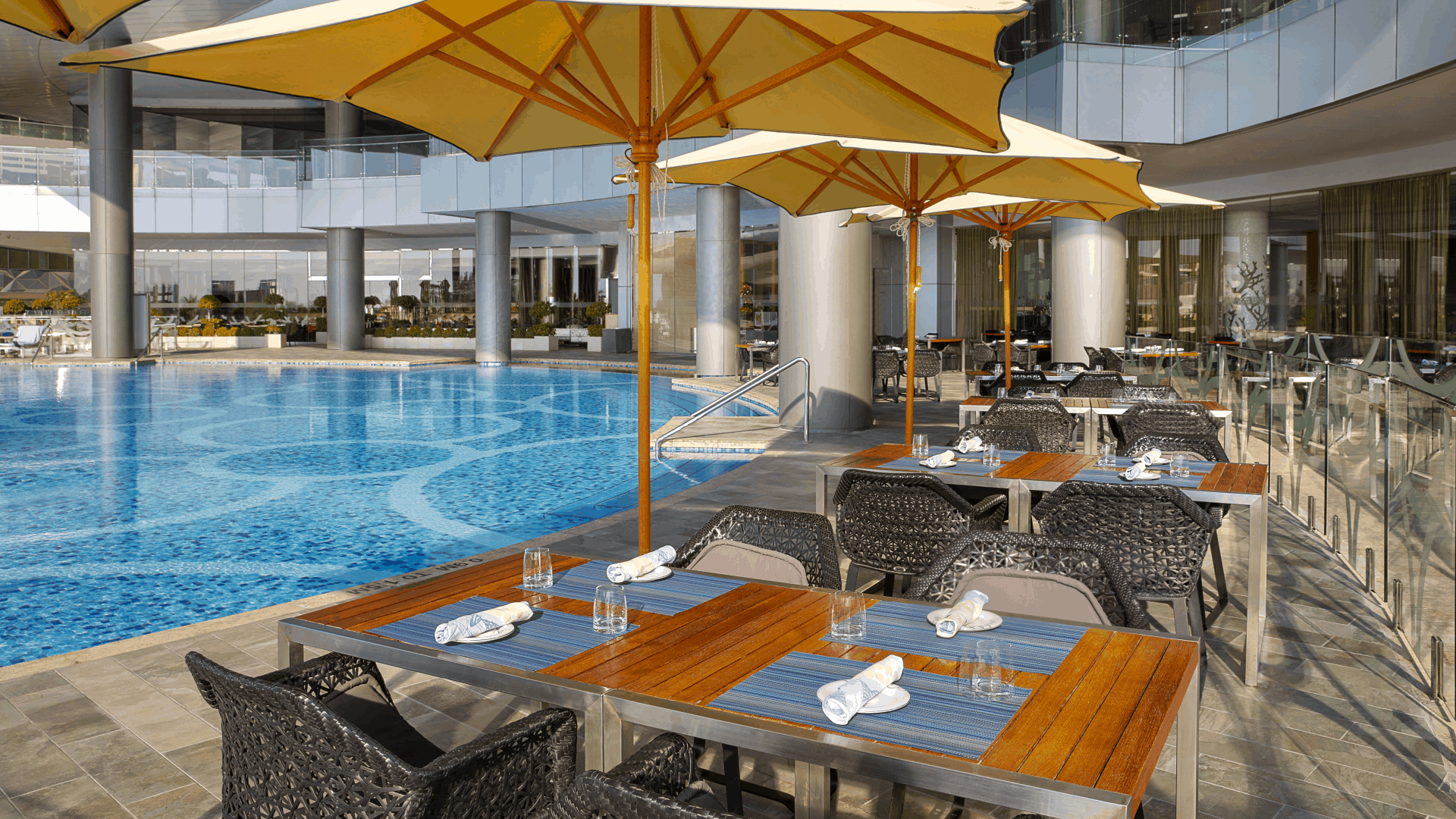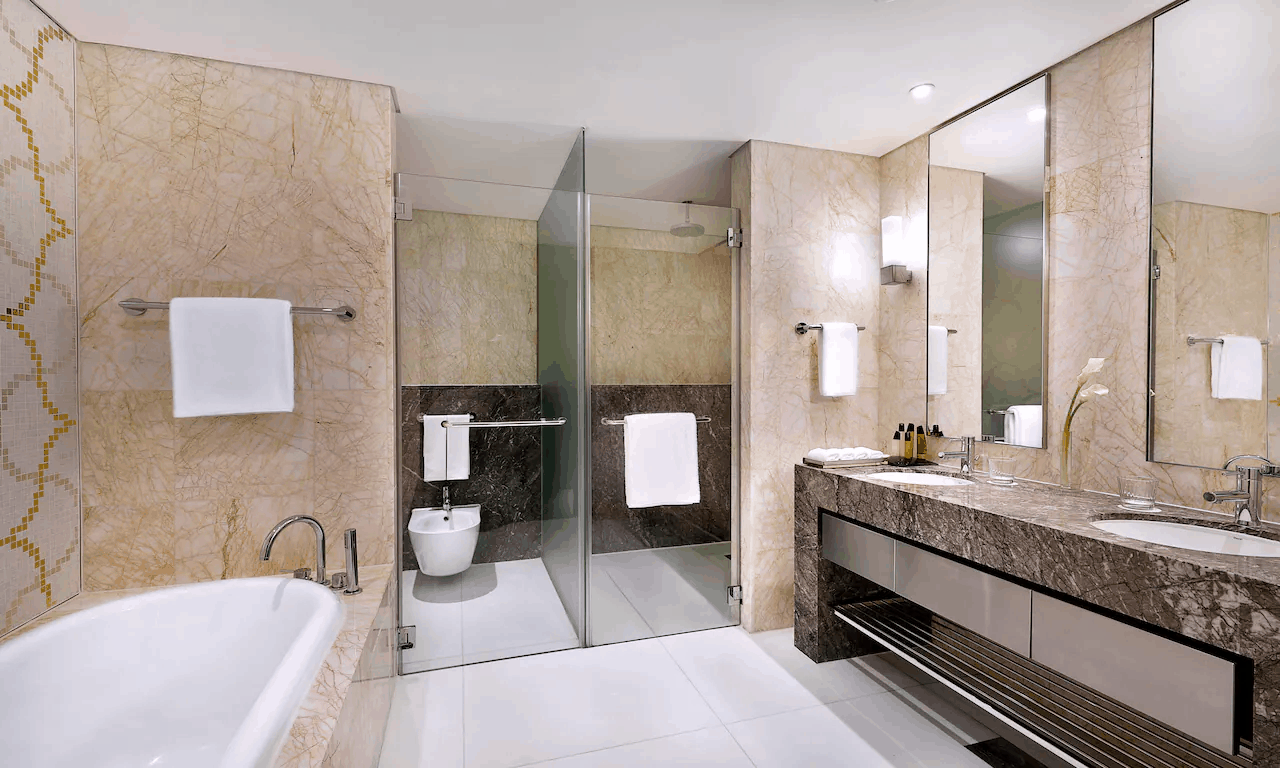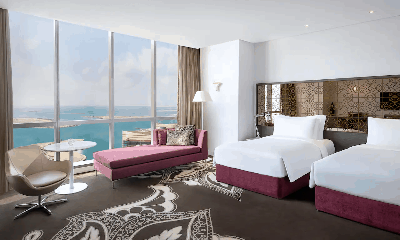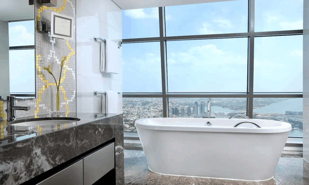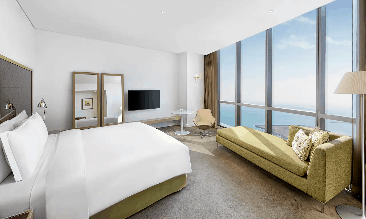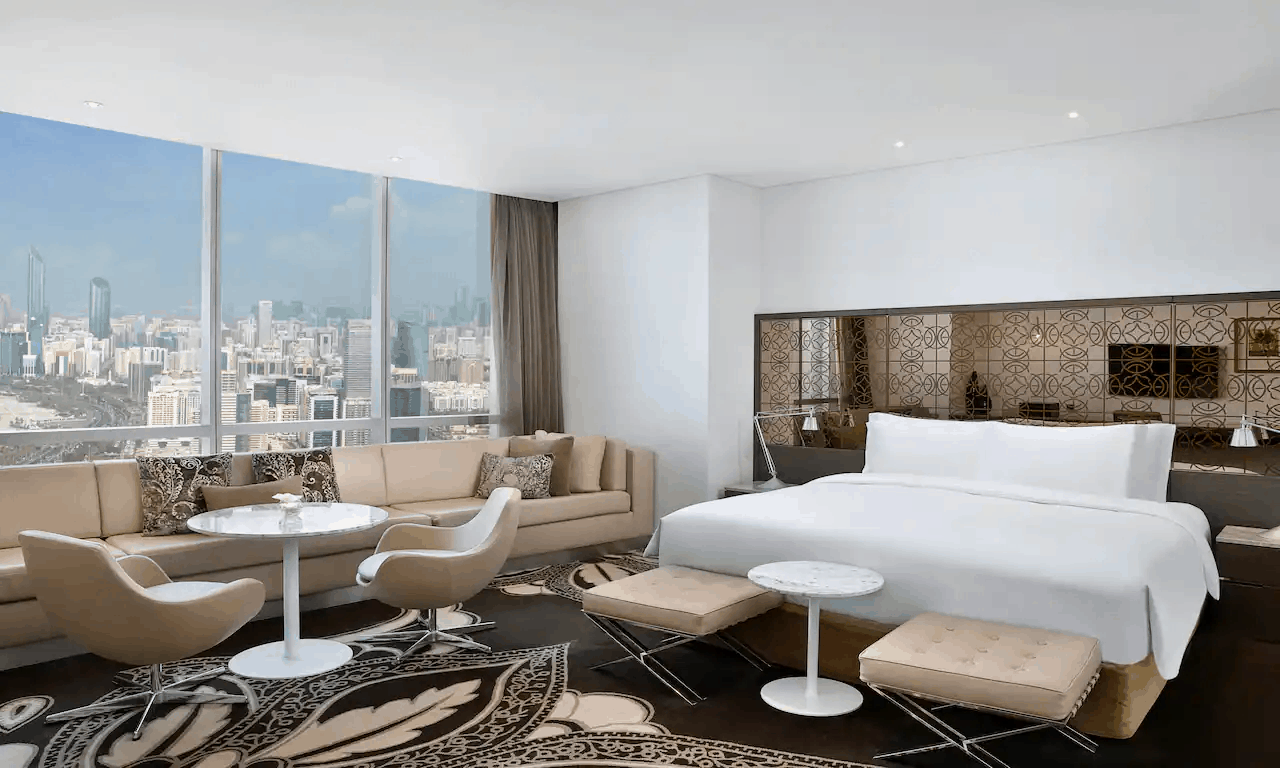В небоскребе комплекса Etihad Towers (с 27 по 60 этаж), на набережной Corniche в районе Ras Al Akhdar, в 37 километрах от международного аэропорта Абу-Даби.