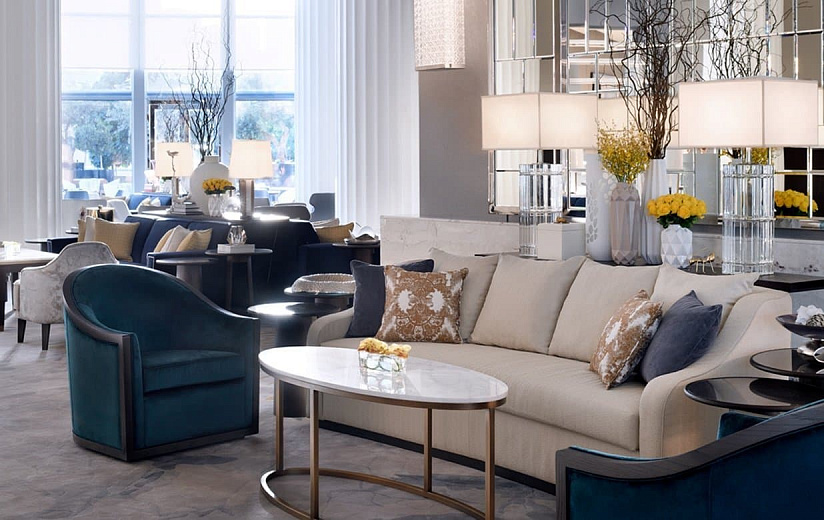 Wi-Fi, интерактивное тв, медиаустройство Apple AirPlay и сервис выбора развлечений. В числе удобств гардеробная с зеркалами Hollywood и гостиная зона с Г-образным диваном. В мраморных ванных комнатах установлены ванна, двойная раковина и тропический душ.
