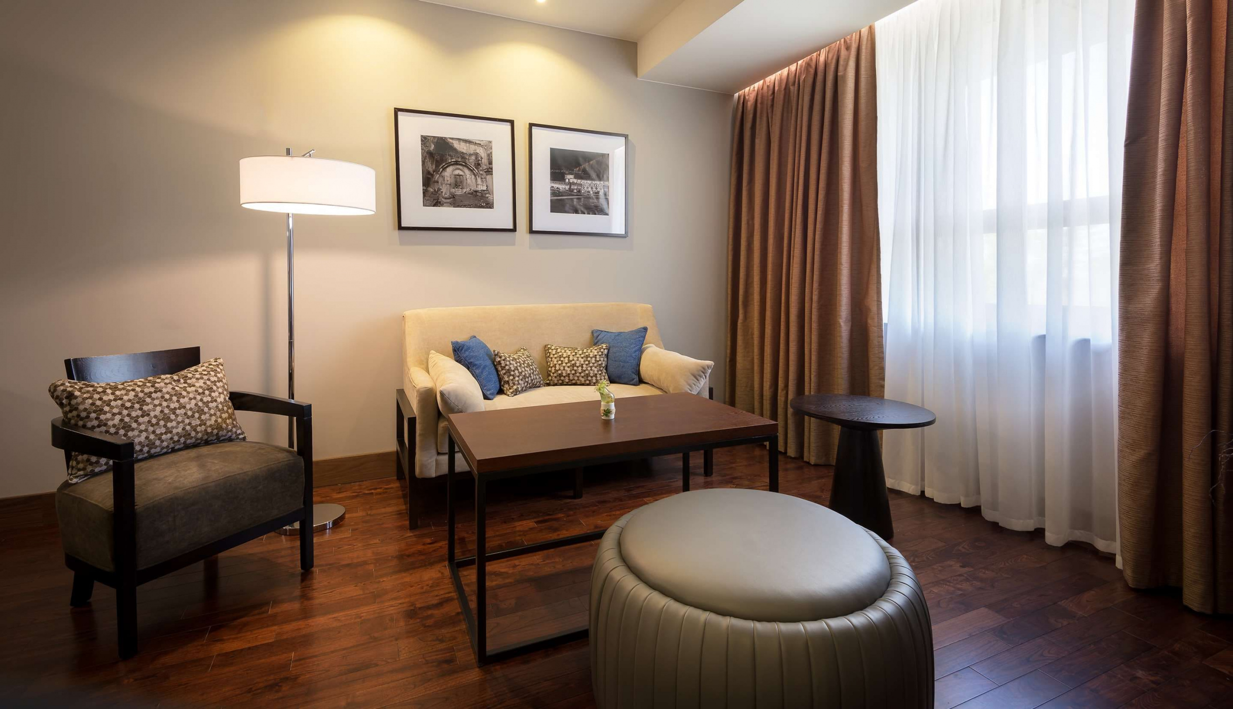 Royal suite (75 кв. м). Гостиная, спальня, ванная комната, гостевой туалет. Вид на город и гору Арарат.