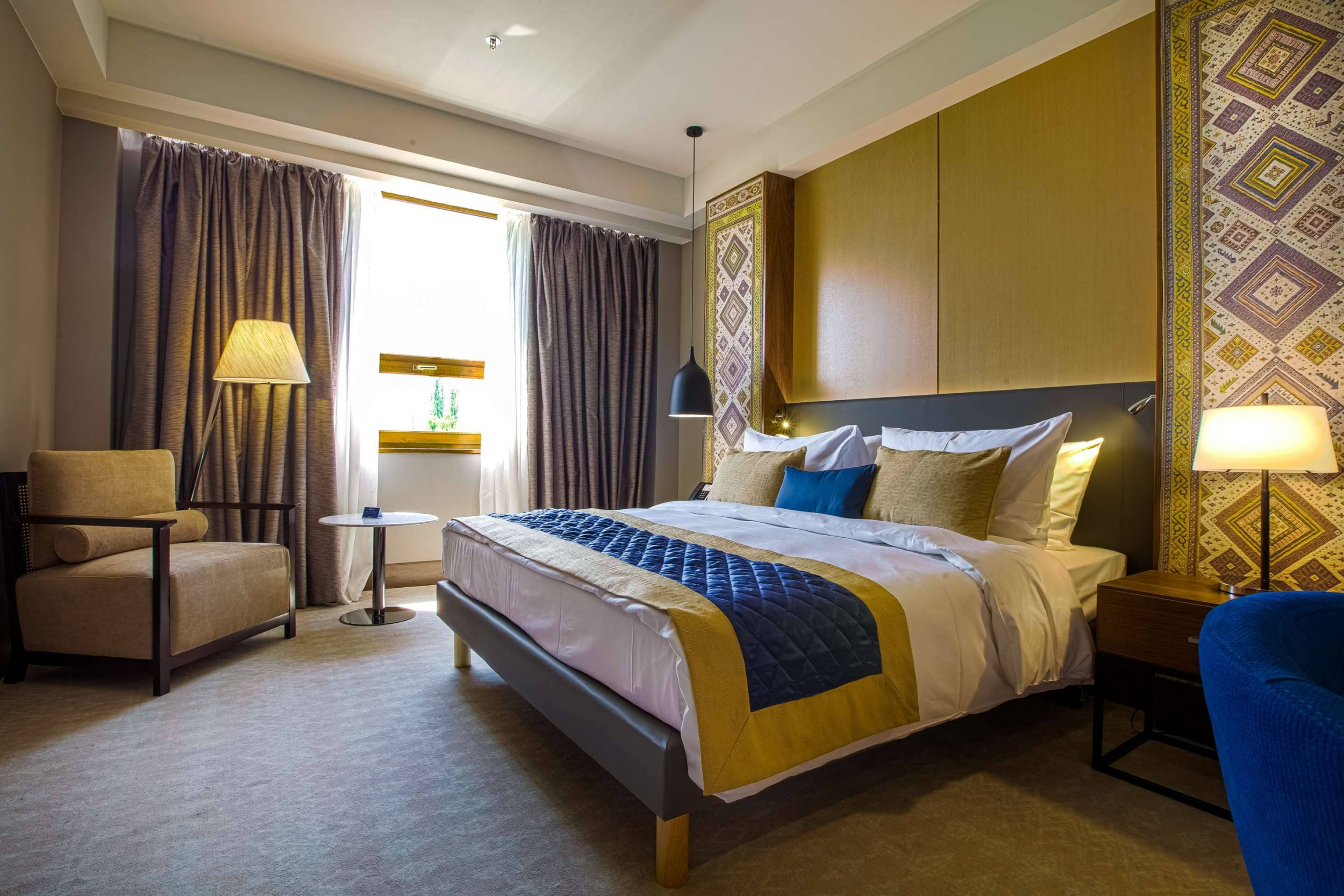 Executive suite (62 кв. м). Спальня с гостиной зоной, ванная комната. Вид на город и гору Арарат.