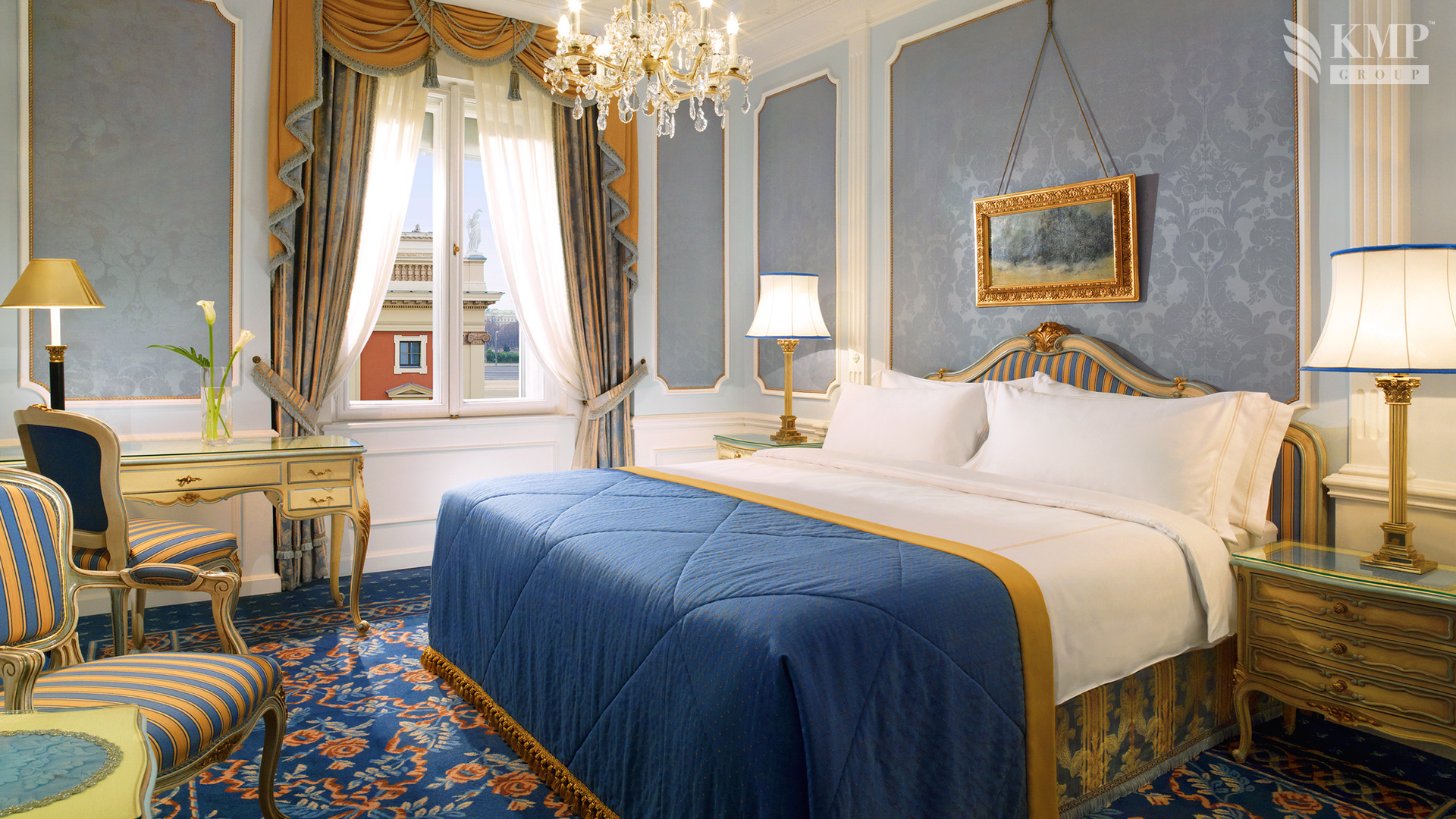 Royal Suite (160 кв. м). Три смежные комнаты с большой гостиной и спальней, украшенные историческим паркетом, мраморная ванная комната с туалетными принадлежностями Bulgari, открытый бар, где вас ждут премиальные ликеры, шампанское и знаменитый торт Imperial. Услуги личного дворецкого.