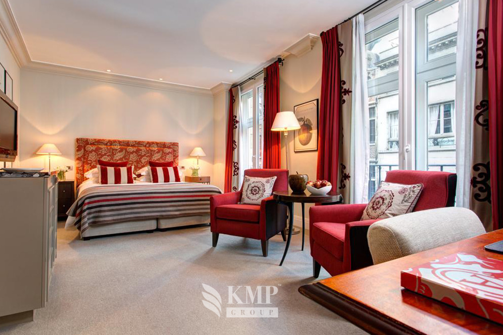 Presidential suite Rene Magritte (110 кв. м). Спальня с гостиной зоной (кровать king-size), ванная комната. Вид на Гран-плац.