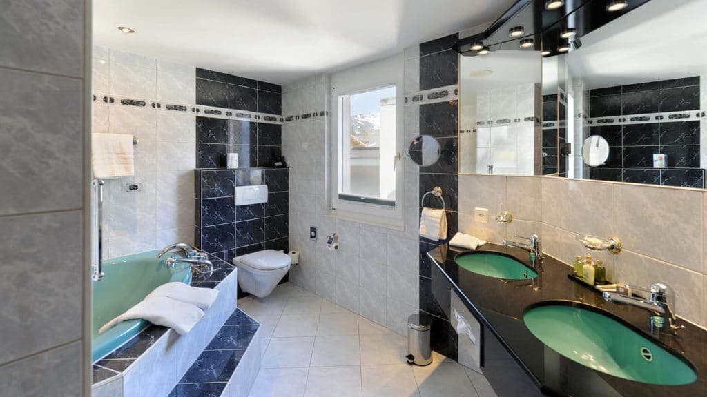 Panoramic Suite (40 кв. м). Suite Top of Aiger – гостиная с камином, спальня, душ, джакузи, вид на юг (Эйгер).