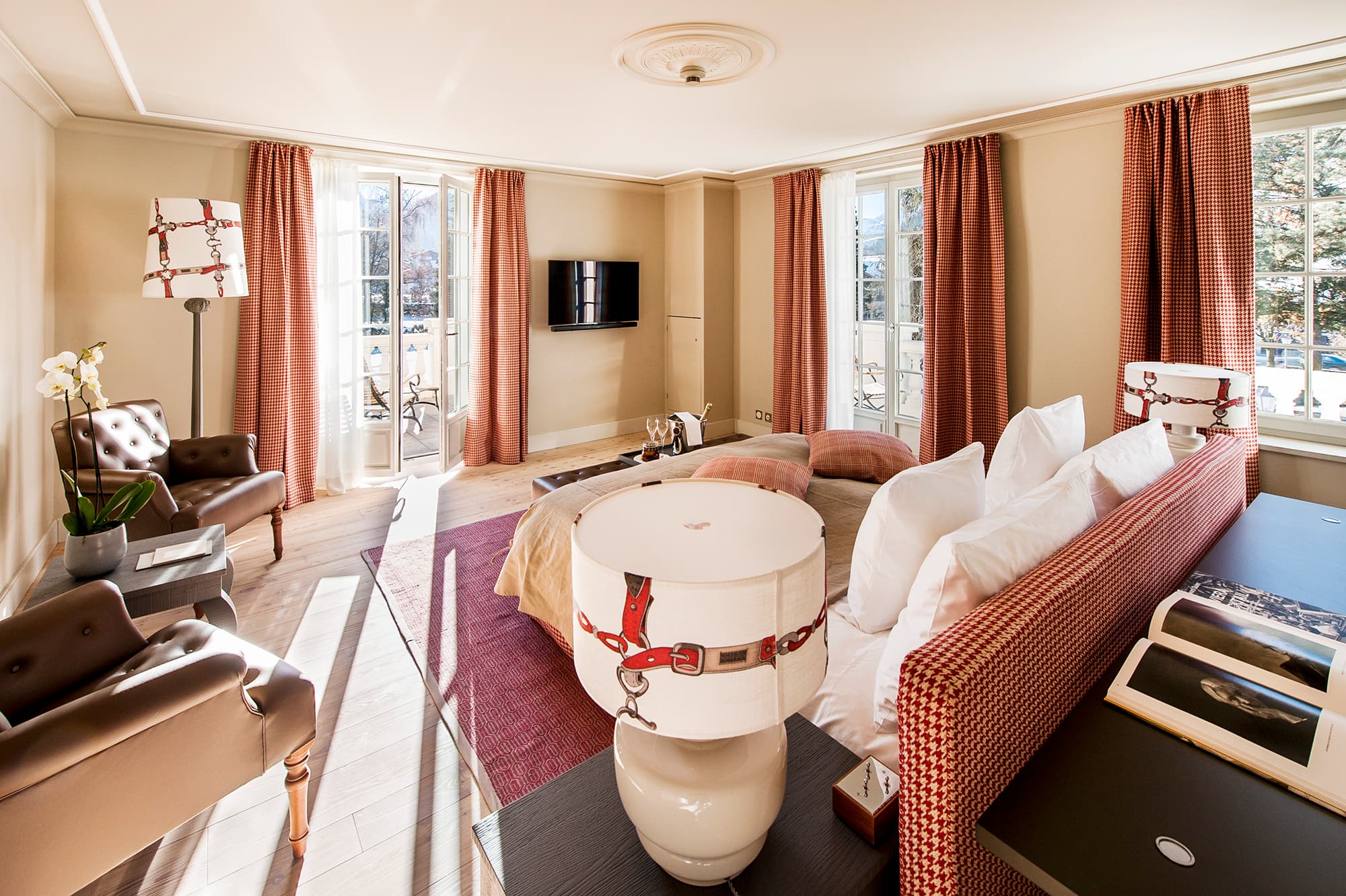 Suite chalet (73 кв. м). Спальня с гостиной зоной, ванная комната. Расположены на 2 этаже корпусов Swiss Chalet. Возможно объединение с номерами категорий Design room и Deluxe room (общая площадь 132 кв. м). Вид на горы.