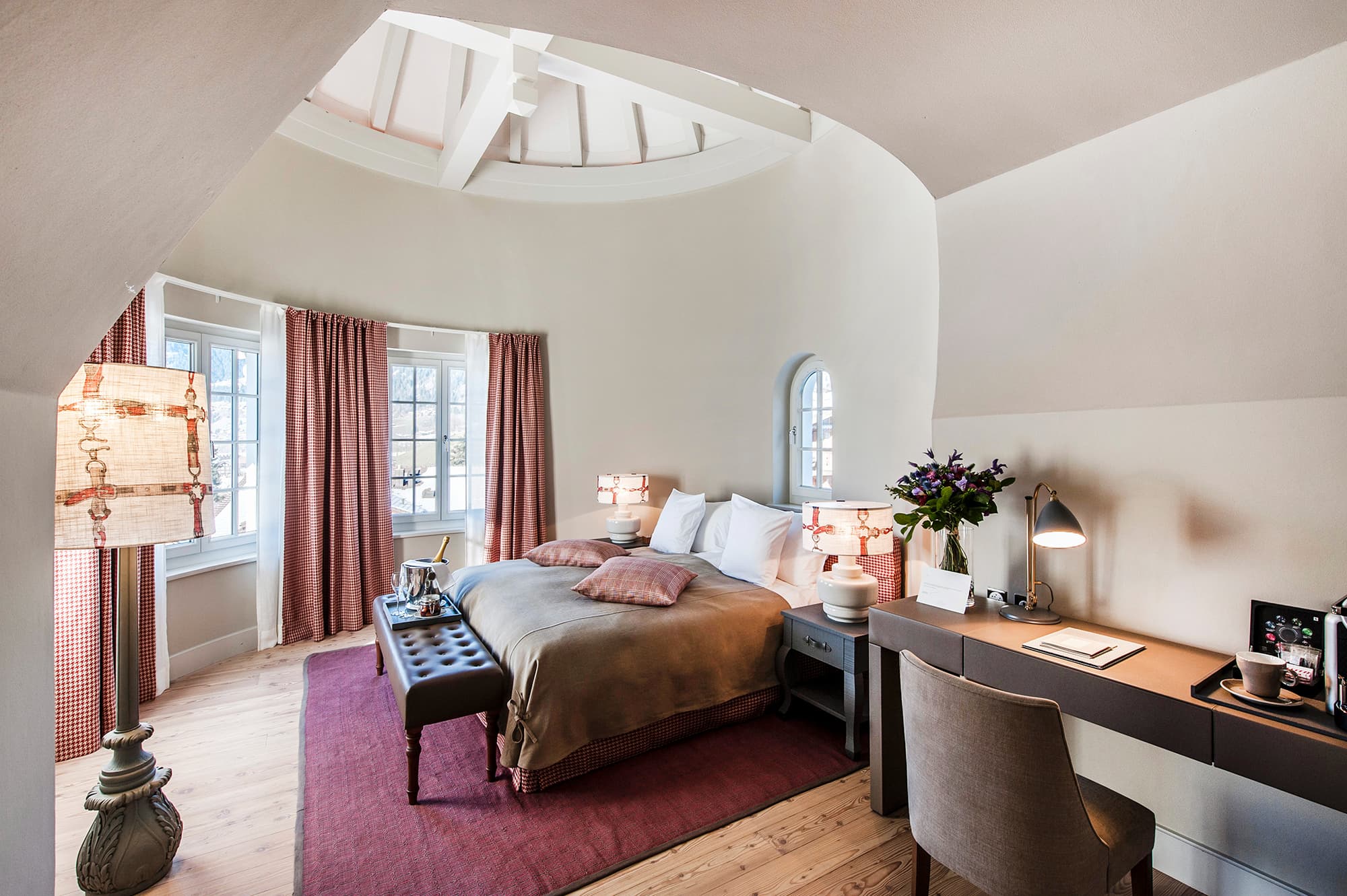 Tower suite (57 кв. м). Спальня с гостиной зоной (кровать king-size), ванная комната с ванной и душем. Расположены с первого по четвертый этаж основного здания. Вид на горы. Возможно объединение с номером категории Design room.