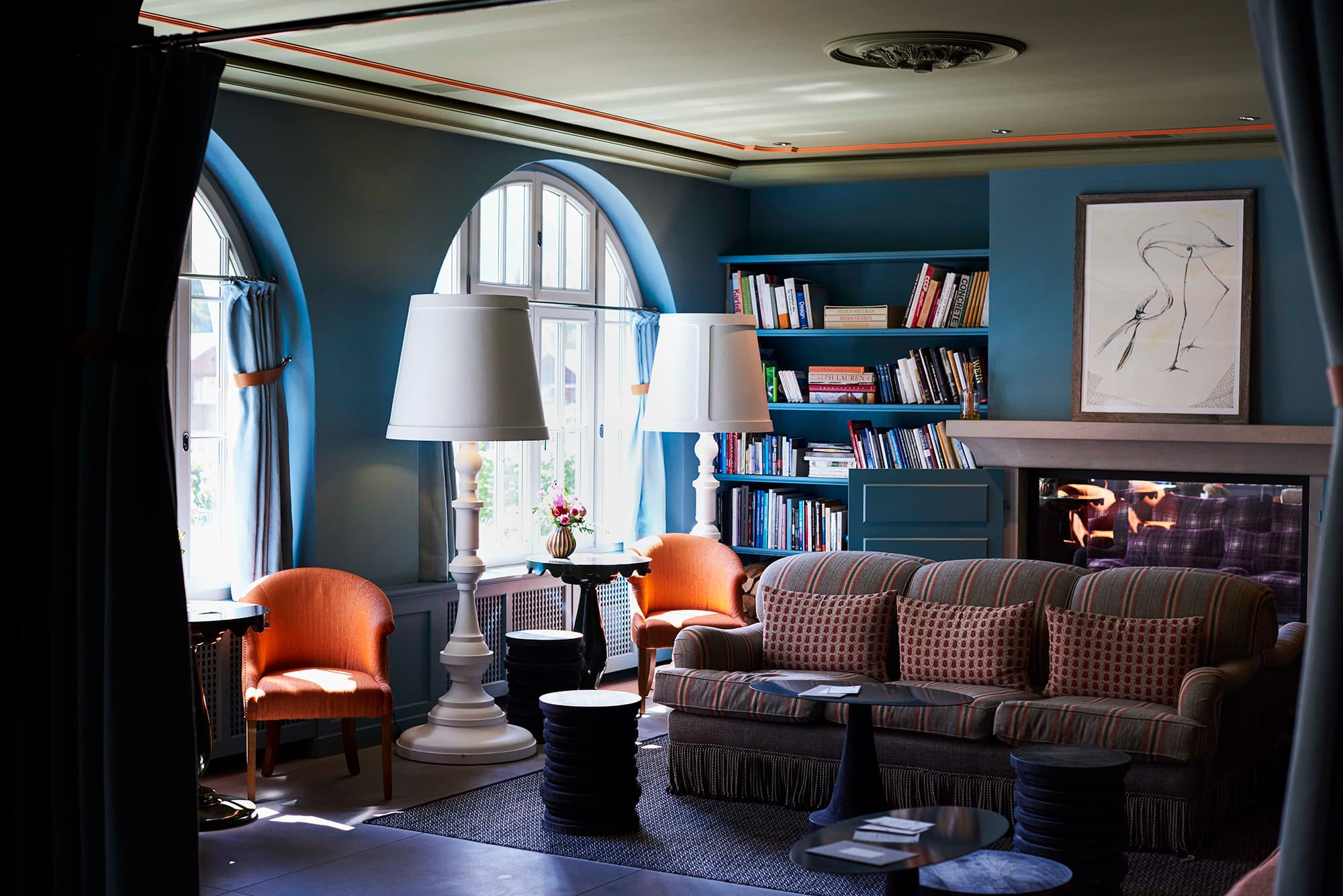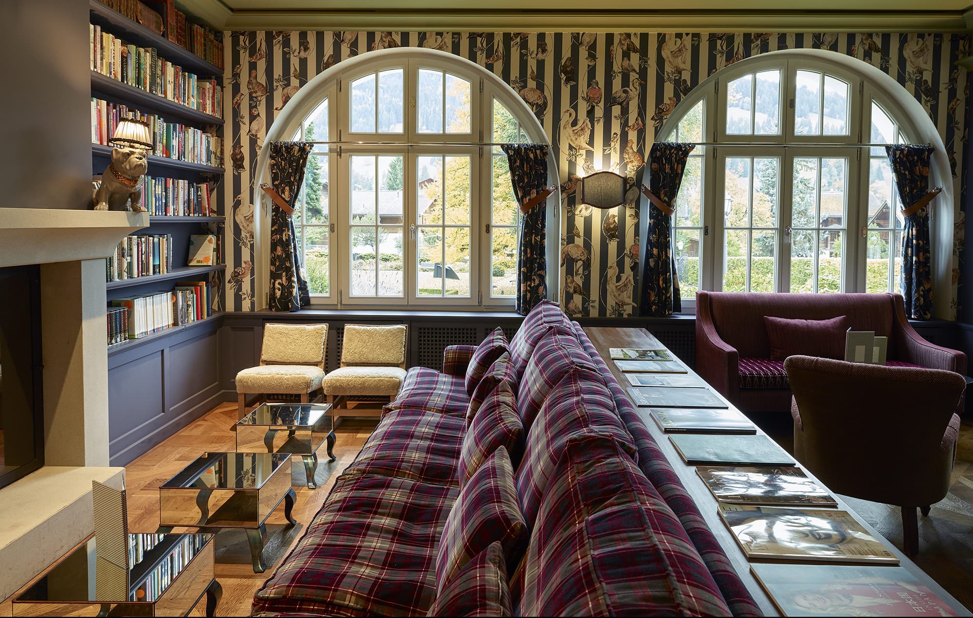 Bellevue suite. Двухэтажный номер. Гостиная с камином, спальня, гардеробная, ванная комната. Вид на гору Oldenhorn.