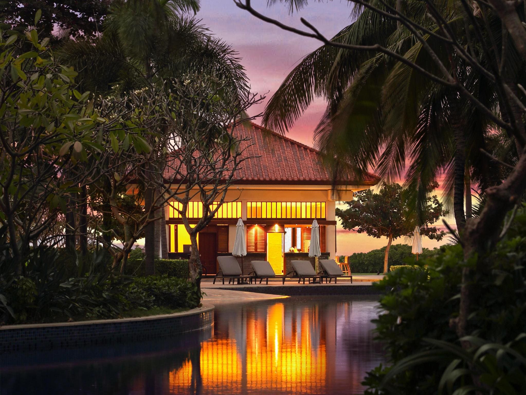 Luhuitou Two Bedroom Pool Villa: 574 м2. Двухуровневая вилла, включает 2 спальни с кроватями king или queen-size и ванными комнатами с ванной на открытом воздухе, обеденную зону на открытом воздухе, павильон для массажа и спа-процедур, душ на открытом воздухе, сад, террасу на 2 этаже, террасу с бассейном (85 м2), зоной отдыха, обеденной зоной и видом на сад. Размещение – 4 человека.