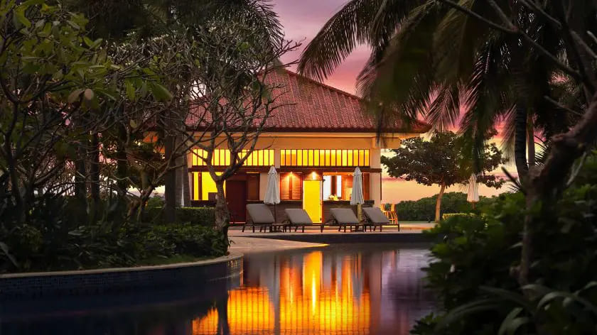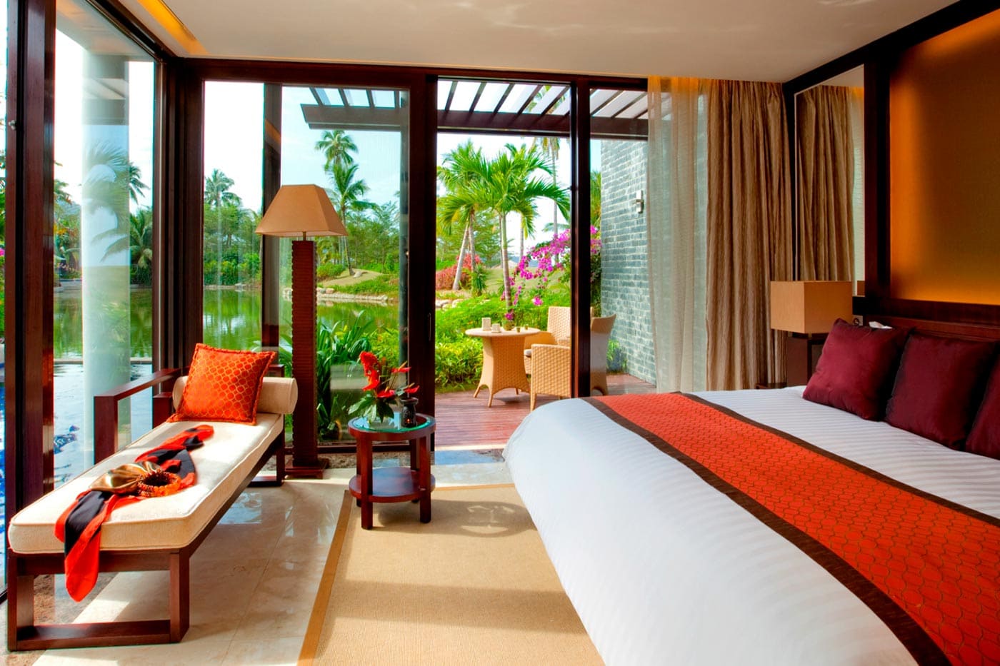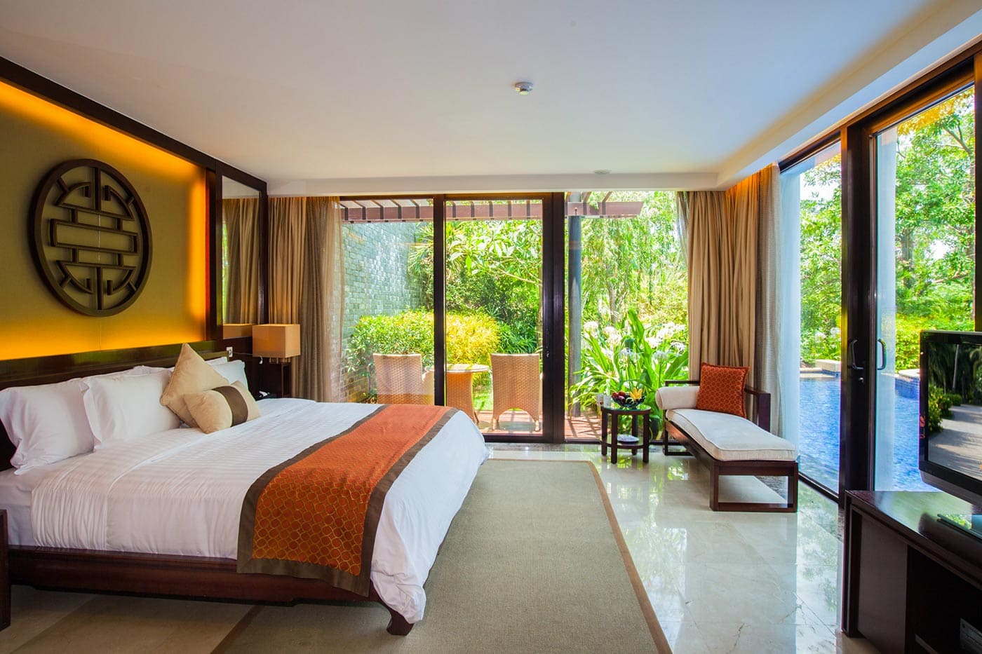 Luhuitou Bay Front Pool Villa: 366 м2. Расположена ближе к пляжу, включает спальню с кроватью king или queen-size и стеклянными стенами, павильон-гостиную, открытый павильон для массажа и спа-процедур, ванную комнату с ванной на открытом воздухе, душ на открытом воздухе, сад, террасу с бассейном, подогреваемой джакузи, зоной отдыха и видом на сад и залив. Размещение – 2 человека.