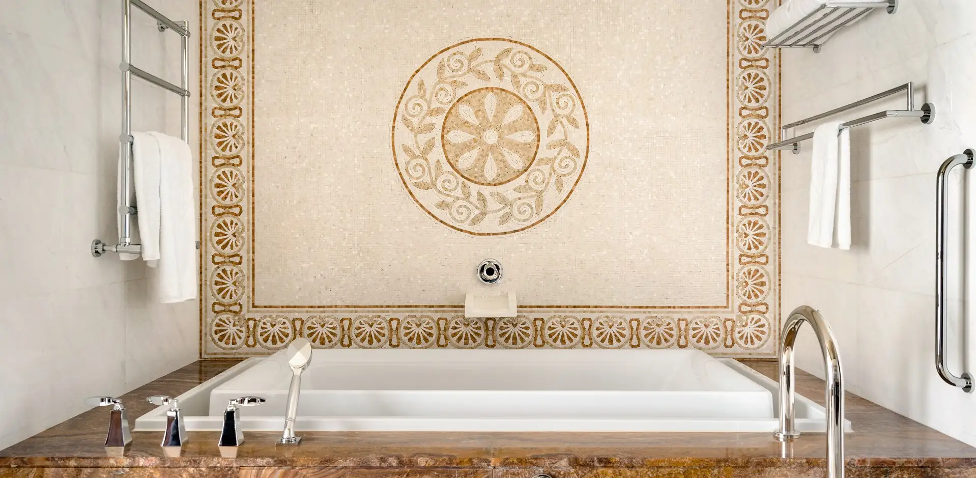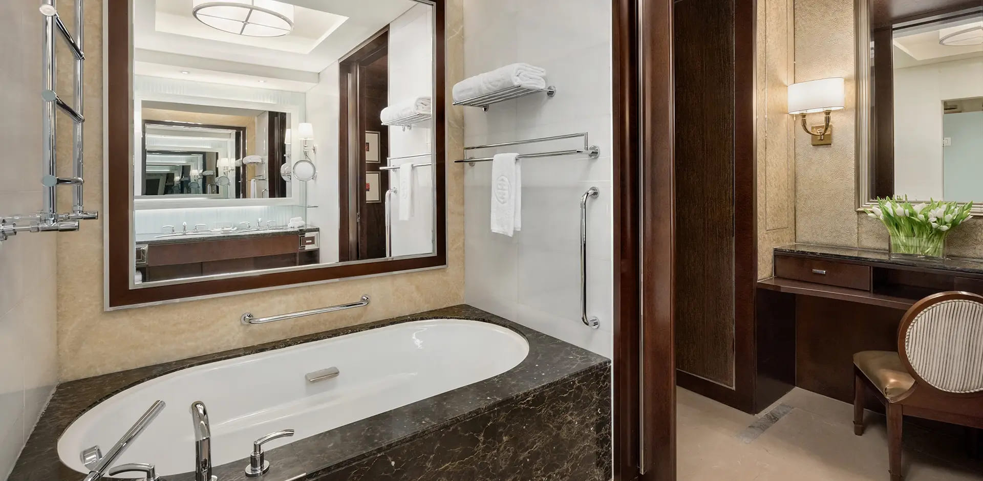 Ambassador suite (174 кв. м). Гостиная с обеденной зоной, спальня, ванная комната с ванной и душевой кабиной с функцией «тропический дождь». Вид на город. Возможно присоединение дополнительной спальни.