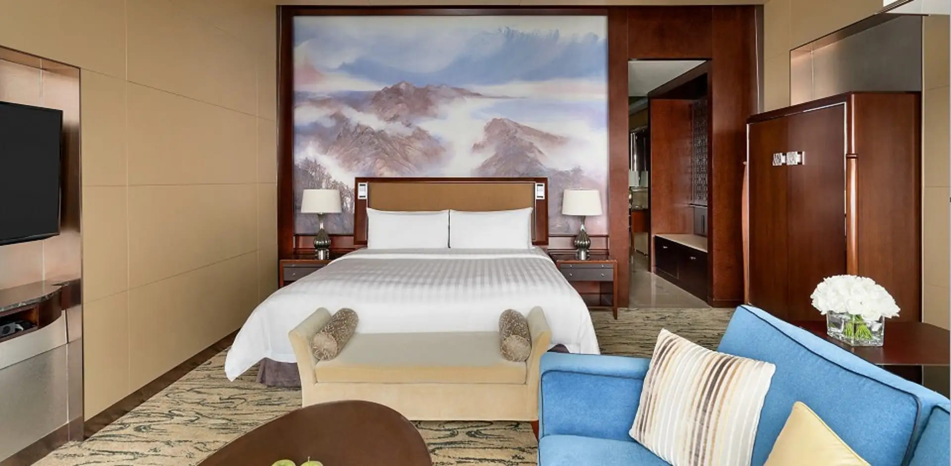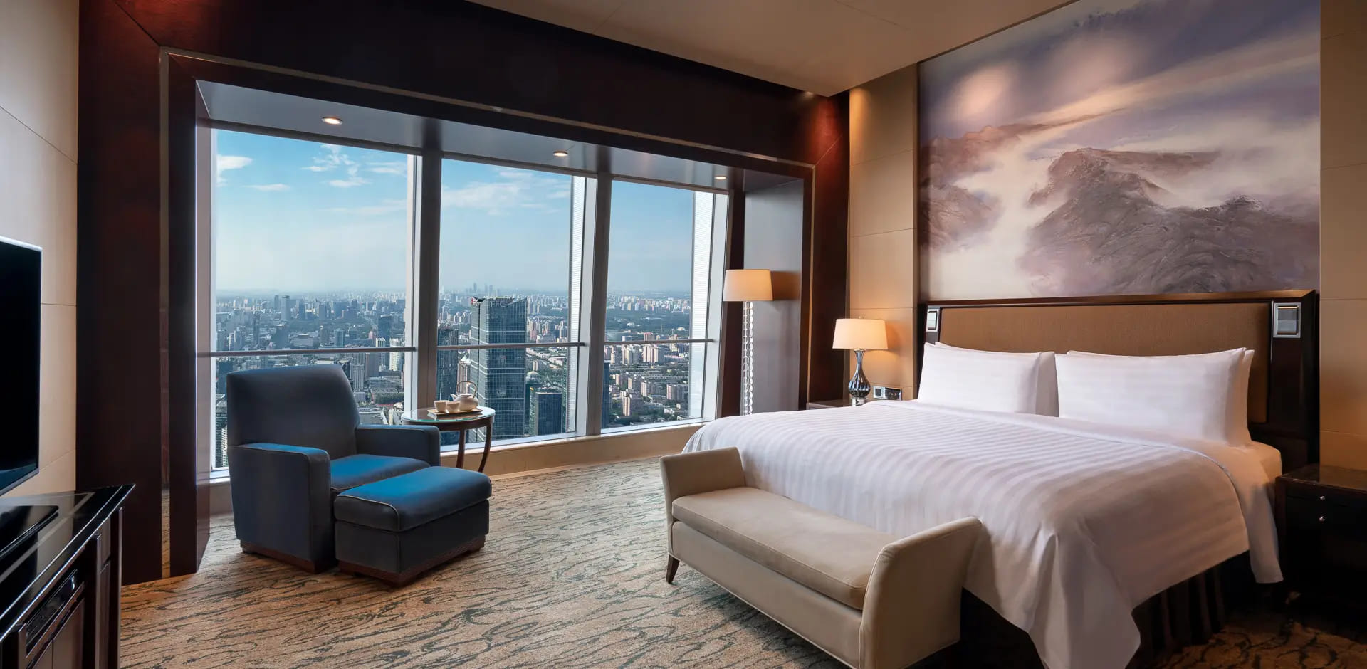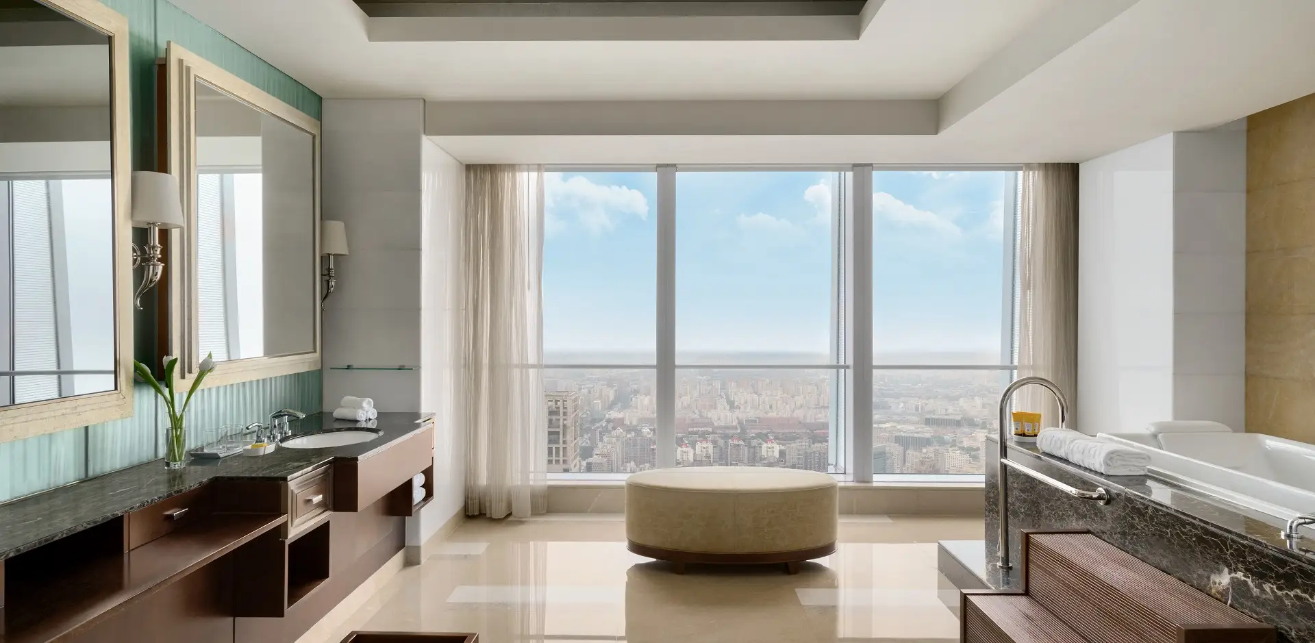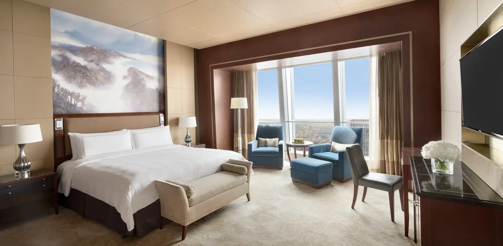 Presidential suite (296 кв. м). Гостиная, столовая, спальня, ванная комната с ванной и душевой кабиной с функцией «тропический дождь». Вид на Запретный город. Возможно присоединение дополнительной спальни.