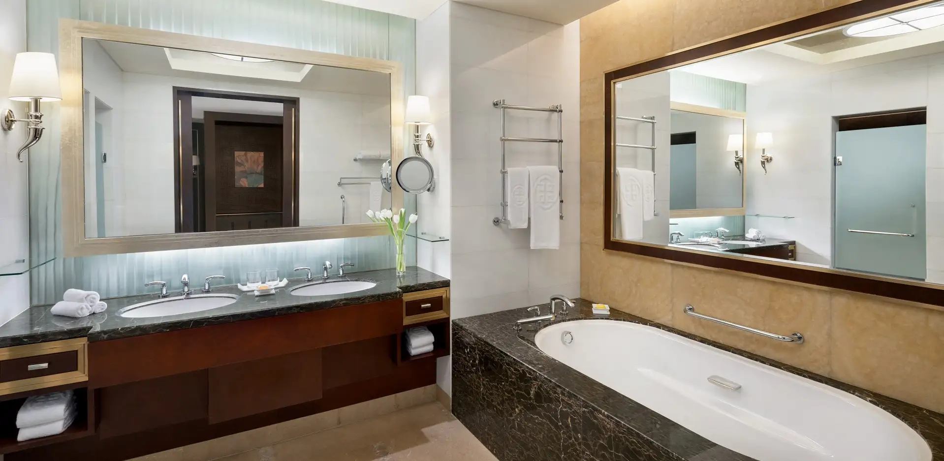 Grand premier room (75 кв. м). Спальня, ванная комната с ванной и душевой кабиной с функцией «тропический дождь». Вид на город.