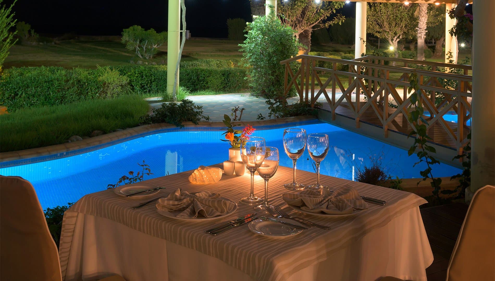 5 ресторанов, 4 бара, 7 открытых бассейнов (в том числе детский бассейн), SPA-центр (закрытый бассейн с морской водой, сауна, хамам, массаж, гидромассаж, талассотерапия, ароматерапия, скрабы, обертывания, программы по уходу за лицом и телом).