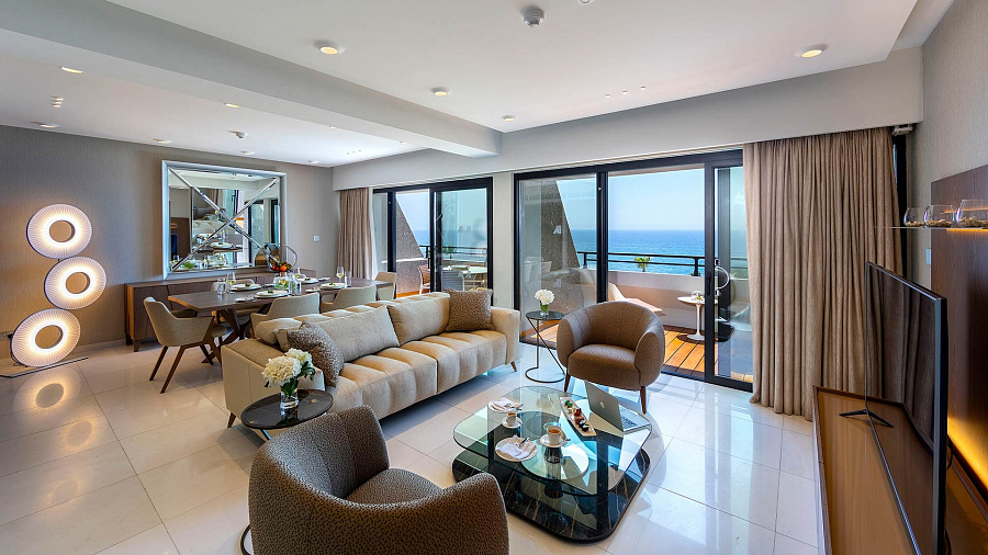 Amathunta suite sea view (50 кв. м ). 2 балкона, гостиная с обеденной зоной (стол на 4 персоны), спальня, ванная комната с ванной. Дополнительно: кофеварка. Расположены на 2 и 4 этаже. Вид на море и сады. Возможно объединение с номером категории Superior sea view room.