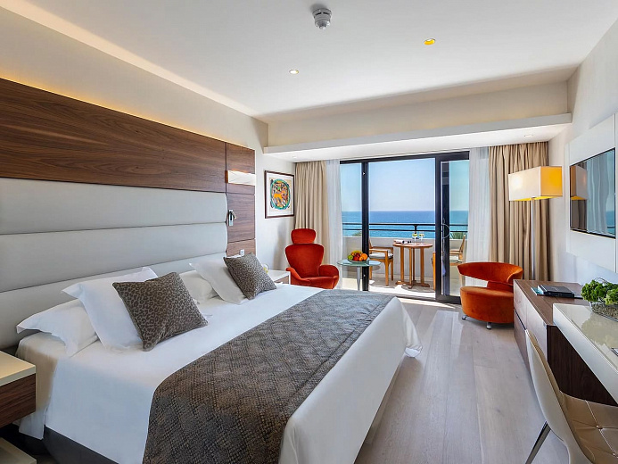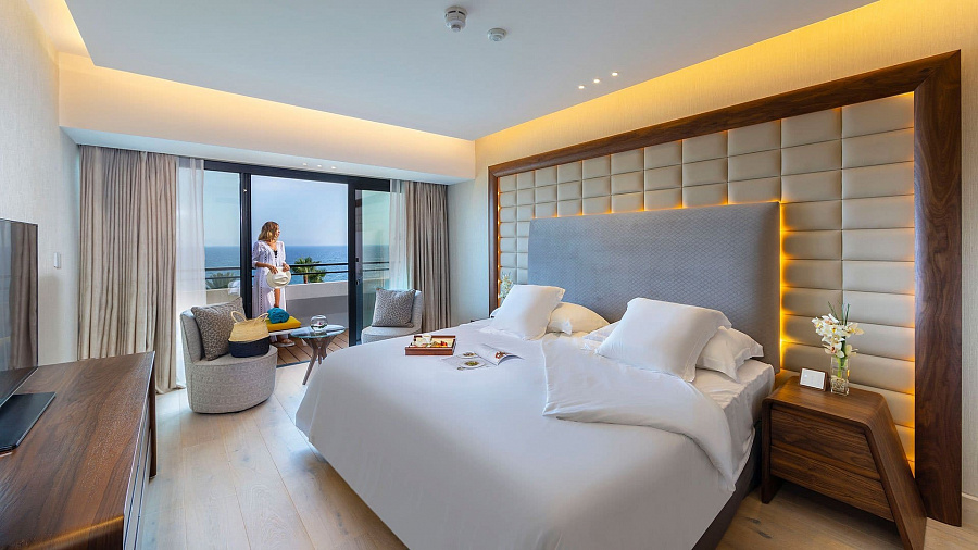 Superior sea view room (26 кв. м). Балкон, спальня, ванная комната с ванной. Панорамный вид на море и сады. Расположены с первого по четвертый этаж. Возможно объединение с номером категории Amathunta suite sea view.
