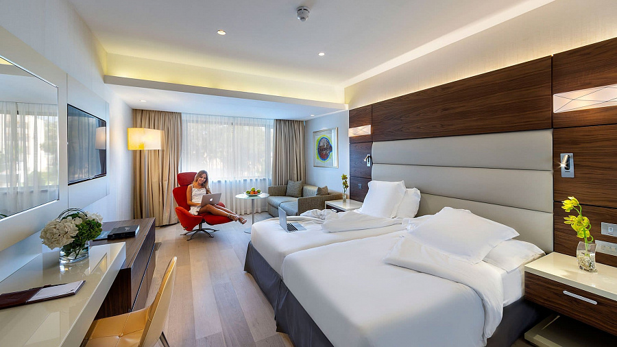 Superior room inland view (31 кв. м). Спальня с гостиной зоной, ванная комната с ванной. Вид на окрестности. Расположены с первого по четвертый этаж.