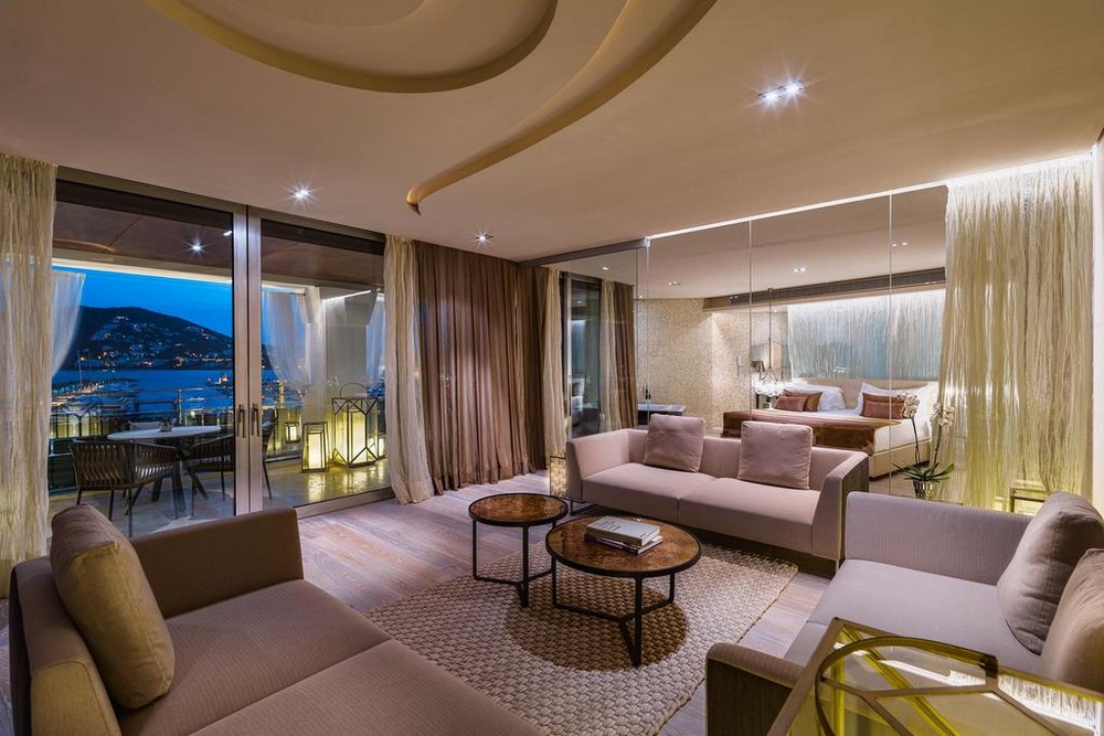 Presidential suite (125-155 кв. м): терраса (50 кв. м) с ванной на открытом воздухе, гостиная зона, 2 спальни (кровать king-size), 2 ванные комнаты. Расположен на 4 этаже. Вид на море, гавань и сады.
