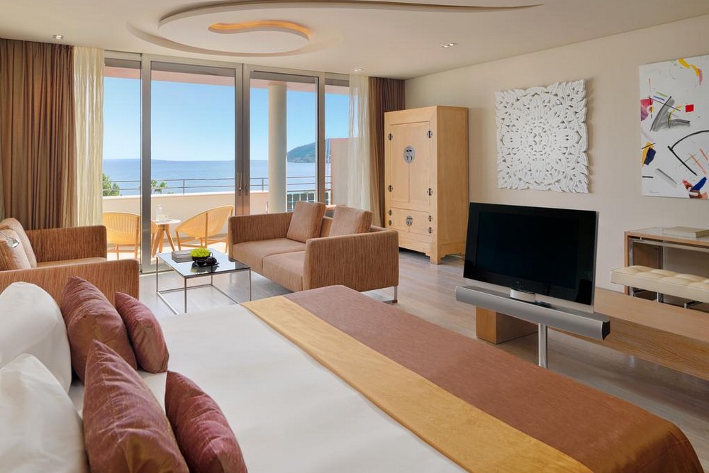Junior suite (46 кв. м): терраса (7 кв. м), спальня с гостиной зоной (кровать king-size или отдельные кровати), ванная комната с ванной и душем. Вид на море.