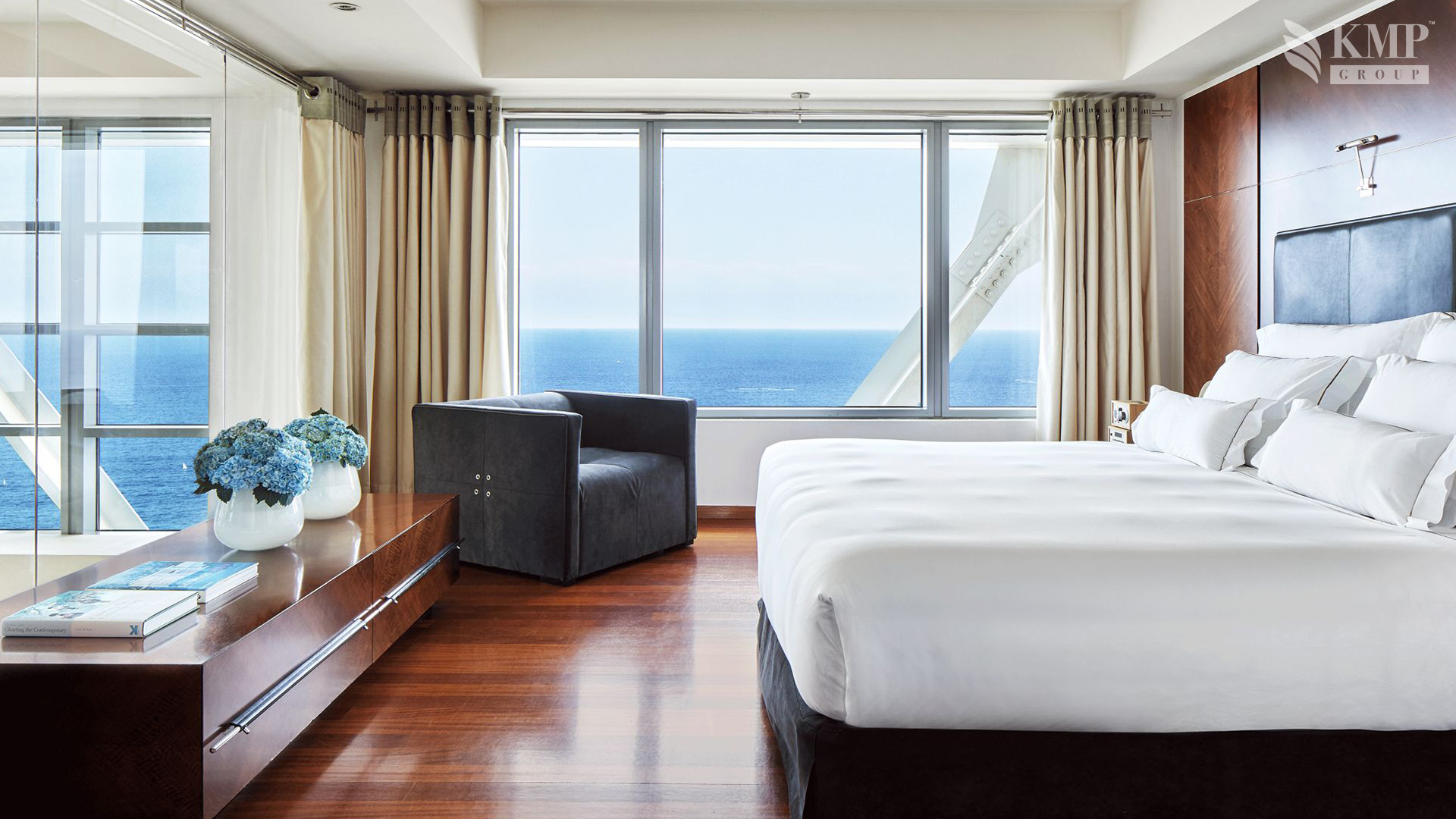 Barcelona Panoramic Room (45 кв. м). Спальня с гостиной зоной, большой двуспальной кроватью или двумя отдельными кроватями, ванная комната с ванной, душевой, двумя раковинами и отдельным санузлом. Из окон открывается панорама Барселоны.