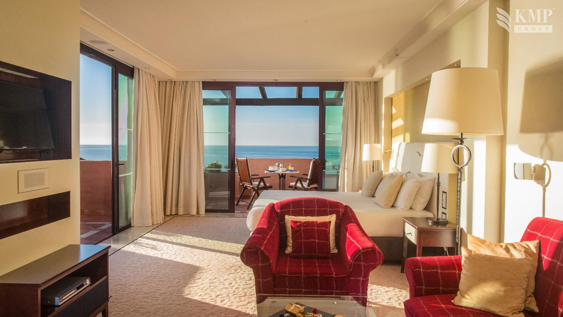 Suite del Mar (150 кв. м). Терраса, гостиная с обеденной зоной (стол на 12 персон), спальня с кроватью king-size, гардеробная, ванная комната с ванной и душевой кабиной. Дополнительно: джакузи. Панорамный вид на море. Услуги дворецкого.
