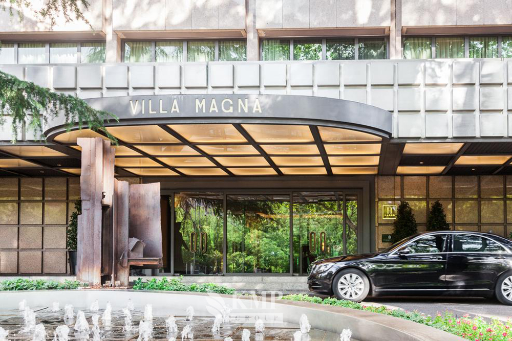 Villa Magna Suite: 65 м2. Состоит из прихожей, спальни с кроватью king-size или двумя кроватями twin, просторной гостиной, отделанной мрамором ванной комнаты, гардеробной, гостевой туалетной комнаты. Номер с видом на бульвар Paseo de la Castellana. Возможно соединение с Deluxe Room. Максимальное размещение — 3 человека. Номера располагаются с 1 по 7 этаж и на 9 этаже.