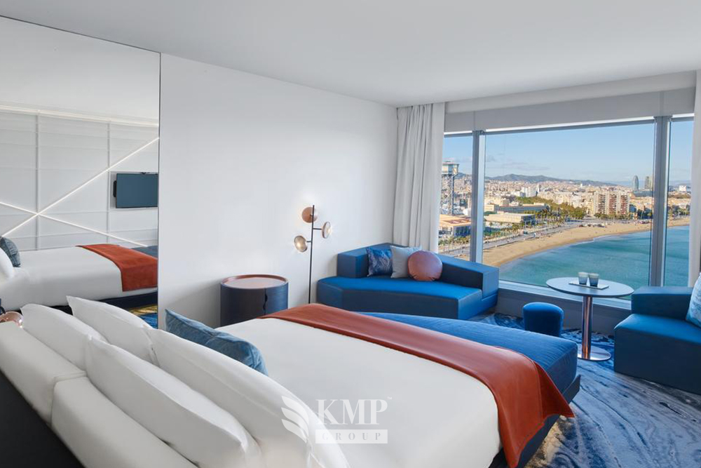 WOW Suite: 177 м2. Шикарный угловой номер, с панорамными, во всю стену окнами; состоит из огромной гостиной с обеденной и рабочей зонами и несколькими зонами отдыха, кухни, 2 спален, 2 ванных комнат с ванной и душевой кабиной, просторной меблированной террасы (31 м2) с открытой джакузи и потрясающим видом на море. Максимальное размещение — 4 человека.