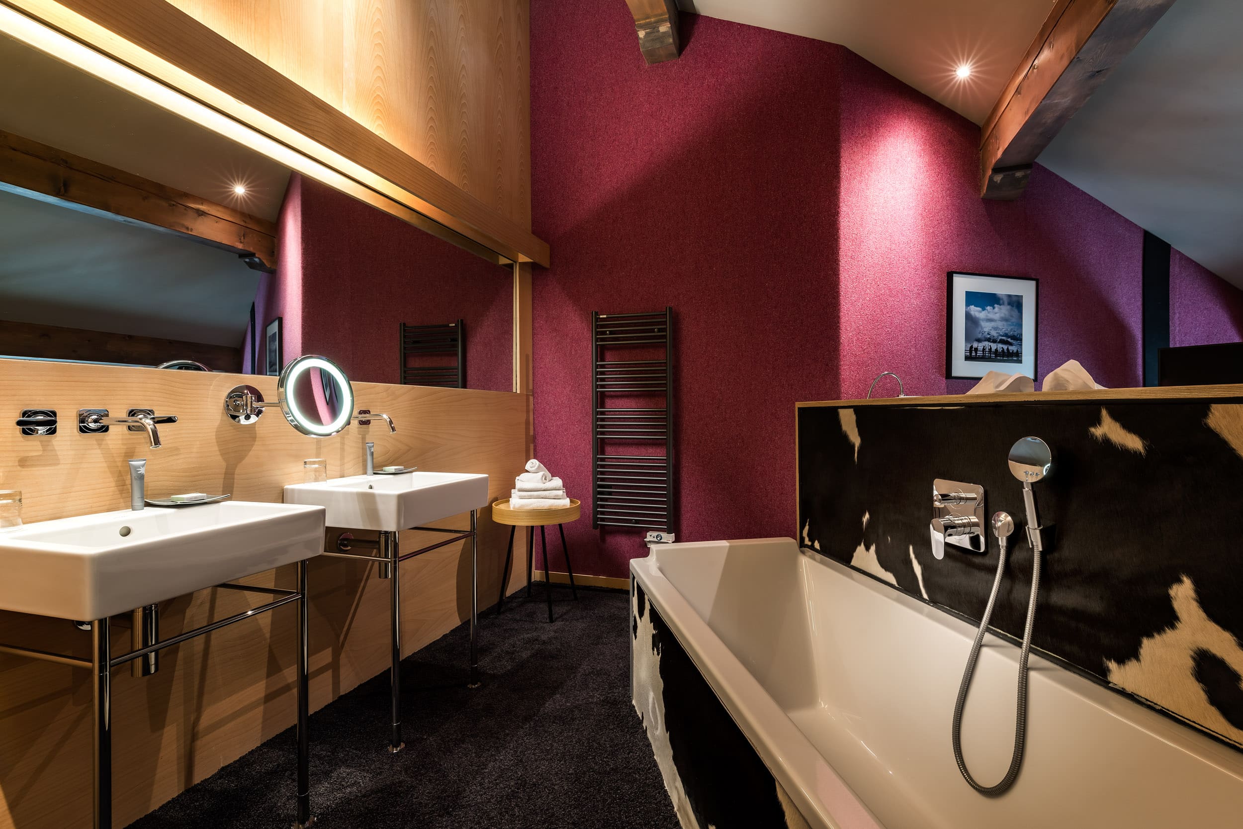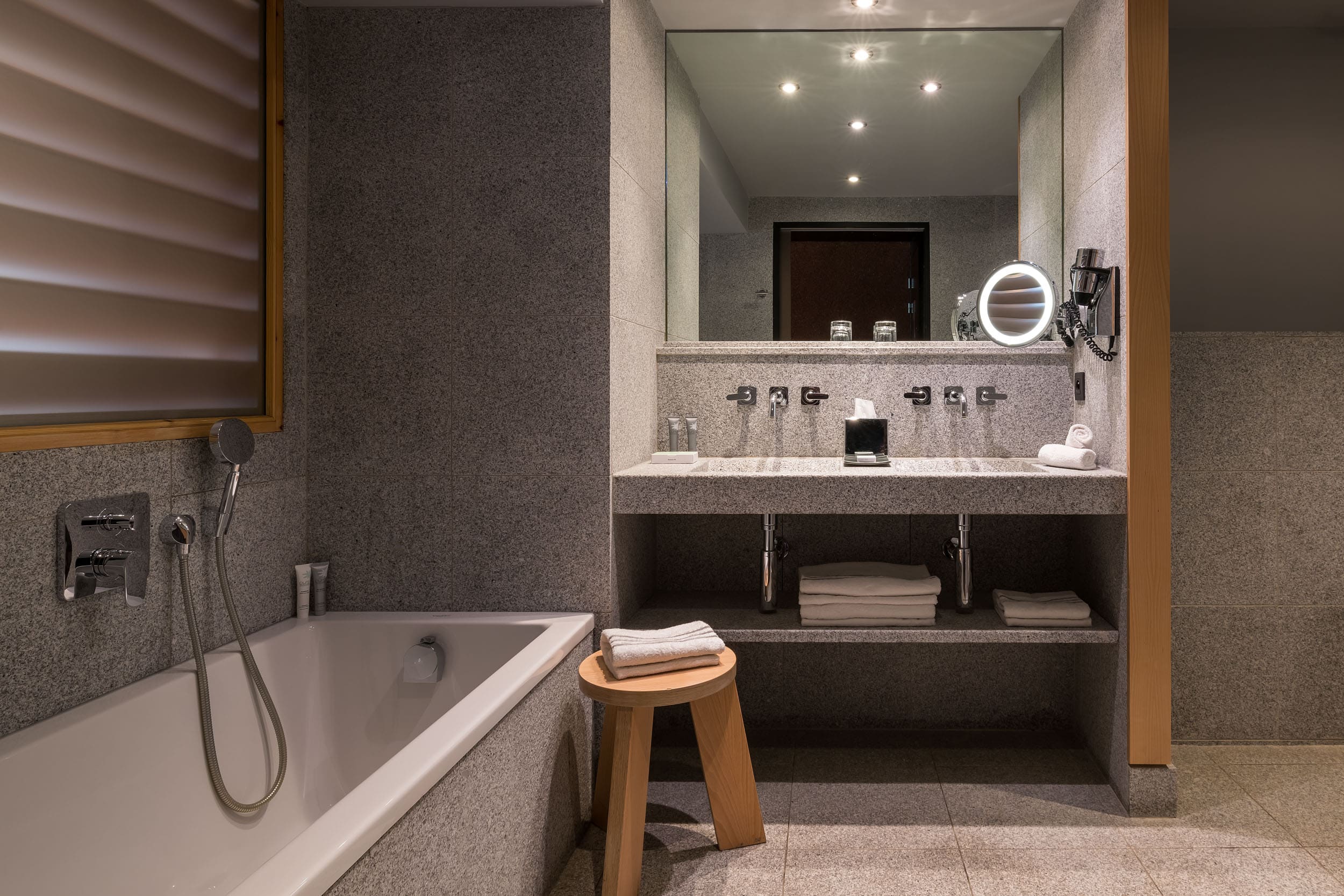 Cocooning suite (50 кв. м). Балкон, спальня с гостиной зоной (двуспальная кровать), ванная комната с ванной и душем. Мансардные потолки. Вид на горы.
