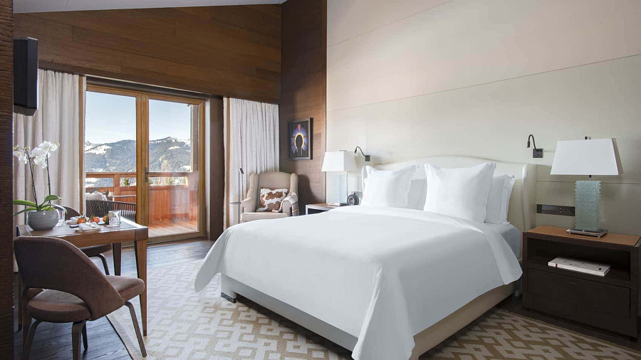 Deluxe one-bedroom suite (78-100 кв. м). Терраса, гостиная с камином, обеденная зона, спальня с кроватью king-size или двумя отдельными кроватями, гардеробная, 2 ванные комнаты (одна - с ванной и душевой кабиной, вторая - с душевой кабиной). Расположены со второго по пятый этажи. Вид на горы или долину. Возможно объединение номеров.