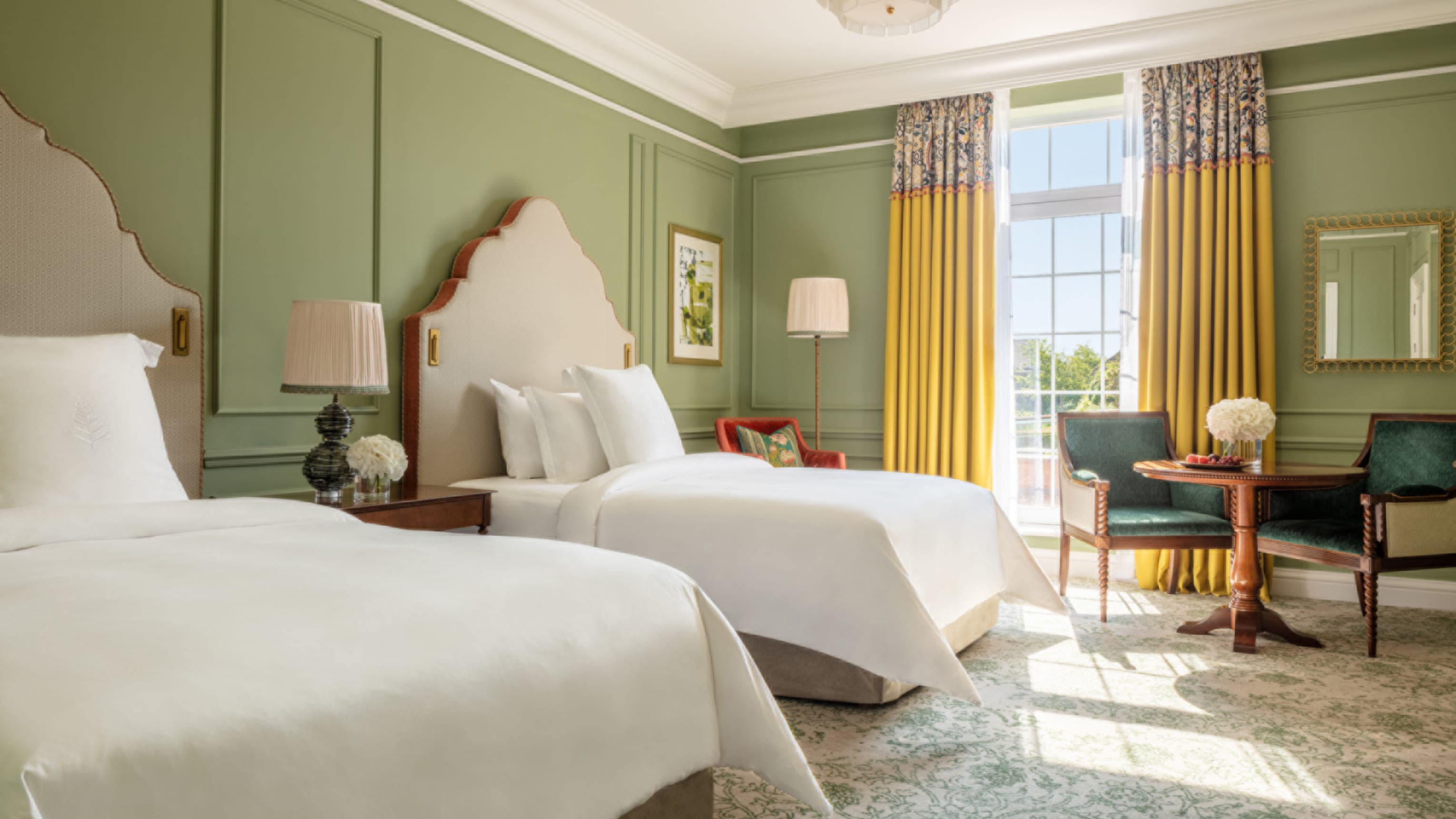 Ellis st. John suite (90 кв. м). Гостиная с обеденной зоной (стол на 4 персоны), спальня с кроватью king-size, ванная комната. Расположены в здании Georgian Manor House. Вид на территорию отеля.
