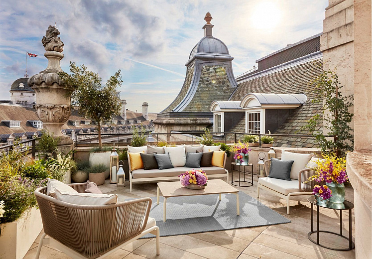 Celestine Suite (178 кв. м). Гостиная с обеденной зоной, мини-кухня, спальня с гостиной зоной и кроватью king-size, гардеробная, ванная комната, гостевой санузел. Предоставляются услуги дворецкого. Вид на улицу Regent Street.