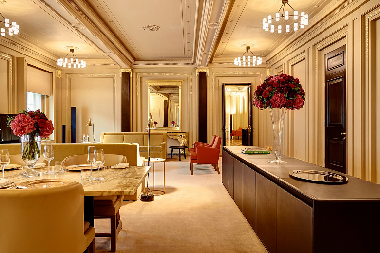 Presidential Suite (290 кв. м). Две гостиные с обеденными зонами, мини-кухня, две спальни с гостиными зонами и кроватями king-size, две ванные комнаты, два гостевых санузла. Предоставляются услуги дворецкого. Вид на город.
