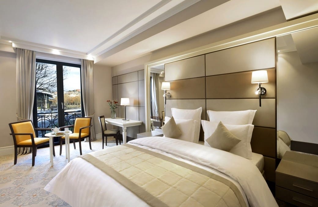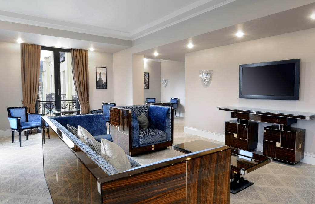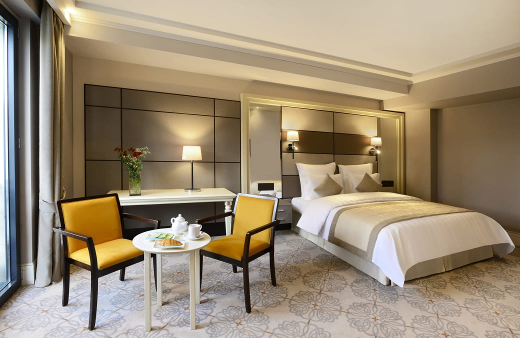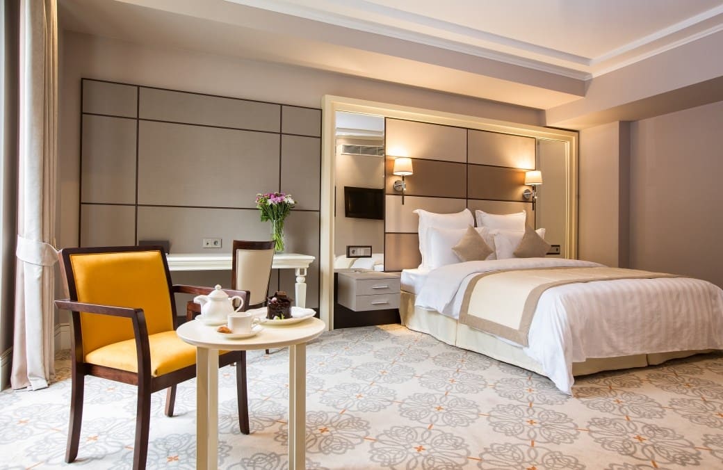 Luxury suite (40-90 кв. м): балкон, спальня с гостиной зоной (кровать king-size), ванная комната с ванной/душем. Расположены с 1 по 4 этаж в исторической части отеля. Вид на реку Куру.
