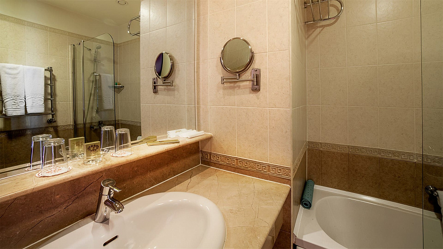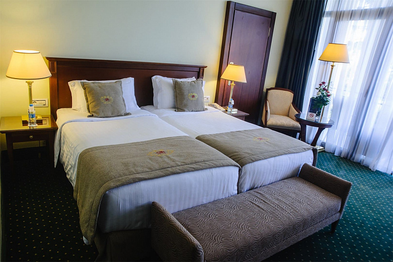 Улучшенный двухместный номер с 1 кроватью и видом на сад и море: Номер с площадью 31 кв.м. с потрясающим видом на Черное море и на сад. Свежий воздух зеленой природы и Черного моря позволит вам удобно спать на 2 односпальных или двуспальных кроватях размера «king-size». ЖК-телевизор с экраном диагональю 40 дюйма, просторная ванная комната, удобный рабочий стол, изящный мраморный обеденный стол, бесплатный высокоскоростной Wi-Fi, кофе-машина, мини-бар, контролируемое кондиционирование воздуха, сейф и напольные весы, все удобства в номере соответствуют потребностям и желаниям вашего гармоничного отдыха.