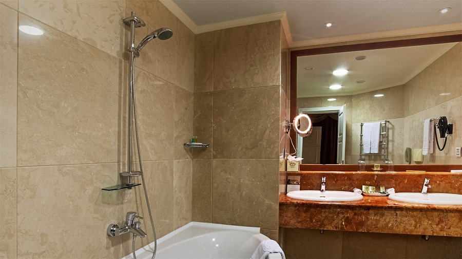Люкс с 2 спальнями: Прекрасный выбор для друзей и семейного отдыха. Роскошный люкс окружен панорамным видом на море и сад. Открыть дверь - значит увидеть захватывающий дух вид на побережье Черного моря и подышать свежим воздухом. Две широкие спальни, удачно подобранный дизайн, широко соответствует роскошным стандартам. Номера оснащены широким выбором лучших удобств, двумя 40-дюймовыми ЖК-телевизорами, просторными ванными комнатами, удобными рабочими столами, бесплатным высокоскоростным Wi-Fi, двумя мини-барами, контролируемым кондиционером, кофемашиной, сейфом, весами в ванной комнате, Все удобства в номере соответствуют потребностям и желаниям вашего и вашего семейного гармоничного отдыха.